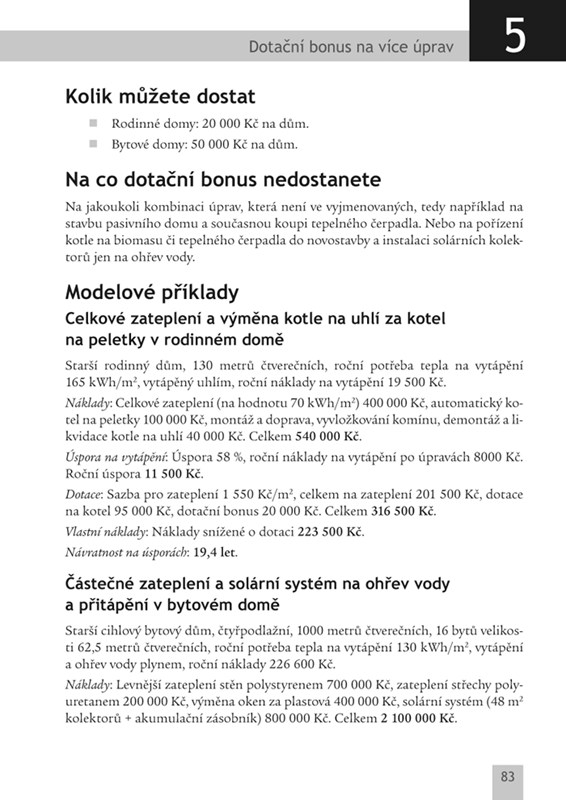 Manuál pro lidi, kteří chtějí mít energeticky úspornější domácnost a současně získat dotaci v programu Zelená úsporám. Tomu odpovídá i dělení knihy na dvě hlavní části - tipy na to, jak udělat domácnost úspornou (zateplení, výměna oken, ekologické topení…) a jak na to dostat dotaci v programu Zelená úsporám. Autoři jsou redaktoři MF Dnes Alice Kupčeková a Filip Grygera, kteří se věnují převážně psaní o energetických úsporách, úsporném stavění a dotacích.