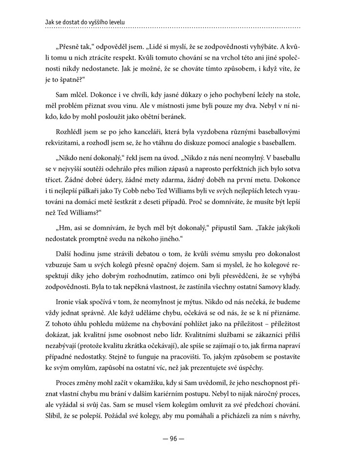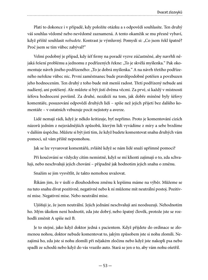 Goldsmithova kniha je přínosem pro každého, kdo se chce „dostat do dalšího levelu“. Pomůže vám odhalit zlozvyky, které vás brzdí v tom, abyste se posunuli dál, a poradí vám, jak tyto špatné návyky napravit. Autor knihy působí jako kouč a pomáhá těm nejúspěšnějším manažerům, aby byli ještě lepší. Odhalte, který z jednadvaceti pracovních zlozvyků vám brání v cestě, a zjistěte: