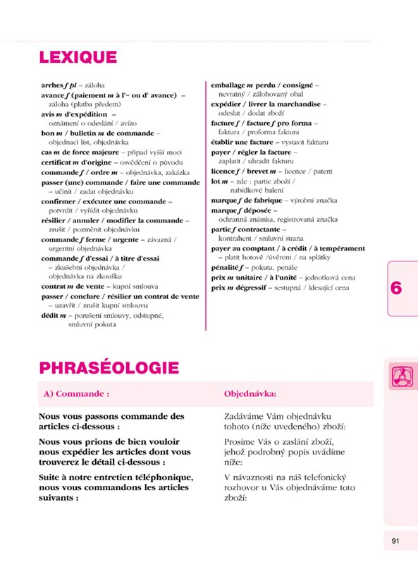 Na konci učebnice je zařazen přehled nejpoužívanějších obchodních zkratek, francouzsko-český a česko-francouzský odborný slovník a klíč ke cvičením.
