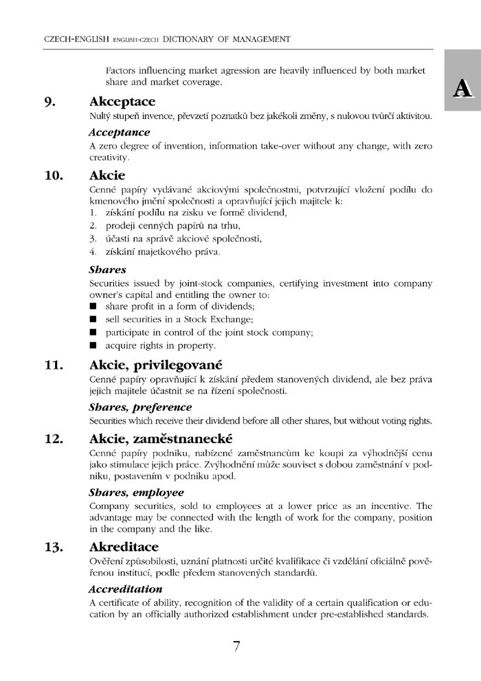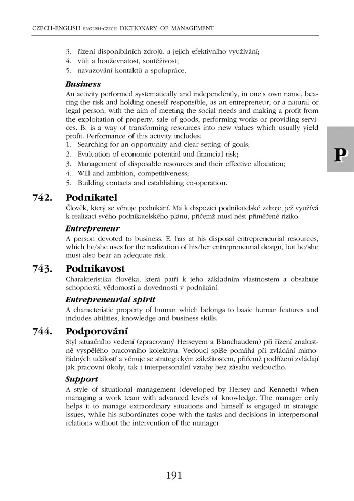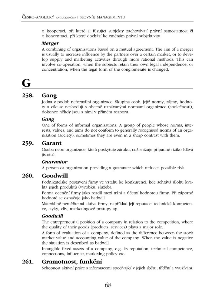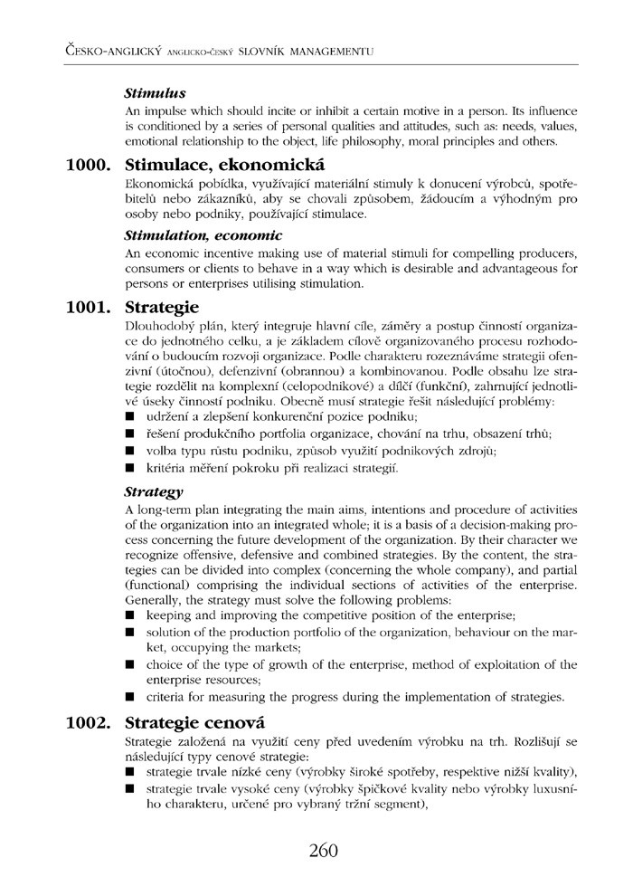 Česko-anglický, anglicko-český slovník managementu vychází společně s německou a ruskou verzí tohoto slovníku. Jednotlivá slovníková hesla jsou očíslována a seřazena podle výchozí české varianty, za jednotlivými hesly následuje překlad v příslušném cizím jazyce.