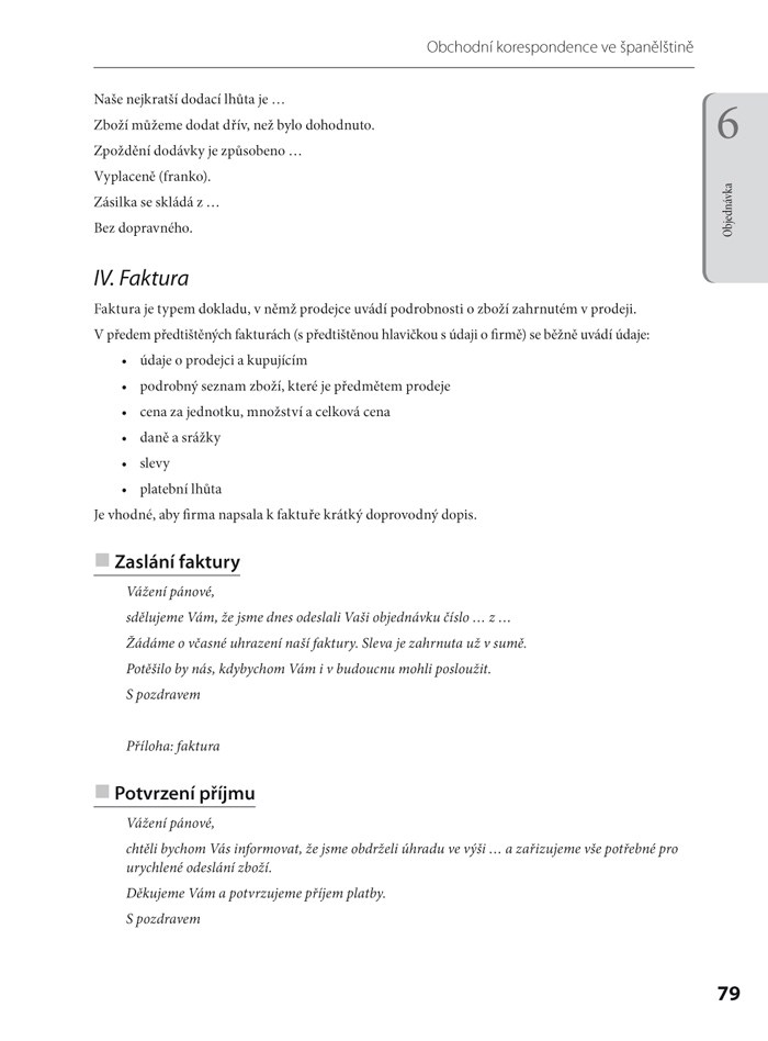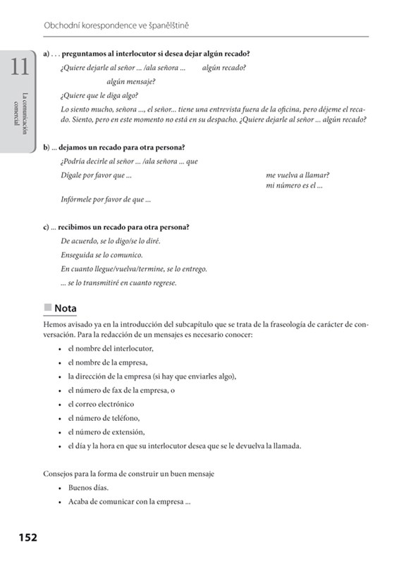 V knize jsou vzory ve španělštině a v češtině sestavené na stranách vedle sebe, abyste mohli jazykové verze snadno navzájem porovnávat, a tak je efektivně využívat. Před každým typem vzorů jsou připojeny komentáře a rady, co bývá u tohoto kroku zvykem a slušností, na co nezapomenout.