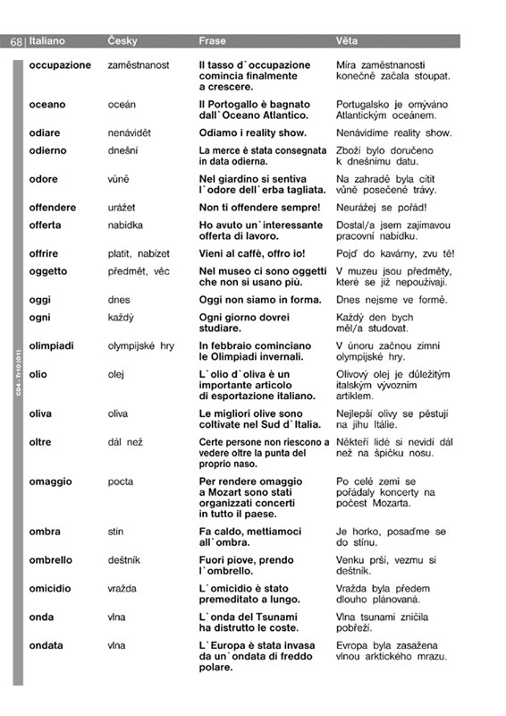 Slova jsou seřazena v abecedním pořadí podle italštiny. Za každým z nich je uveden český překlad a následuje příkladová věta. Uvědomíte si tak vazby a kontext, ve kterém bývá daný výraz nejčastěji používán.