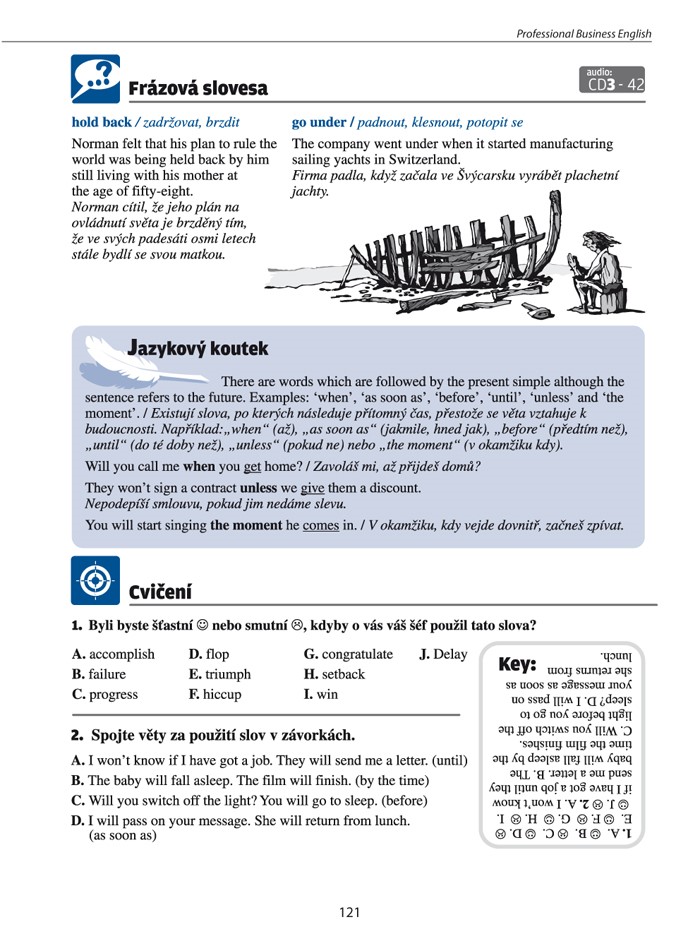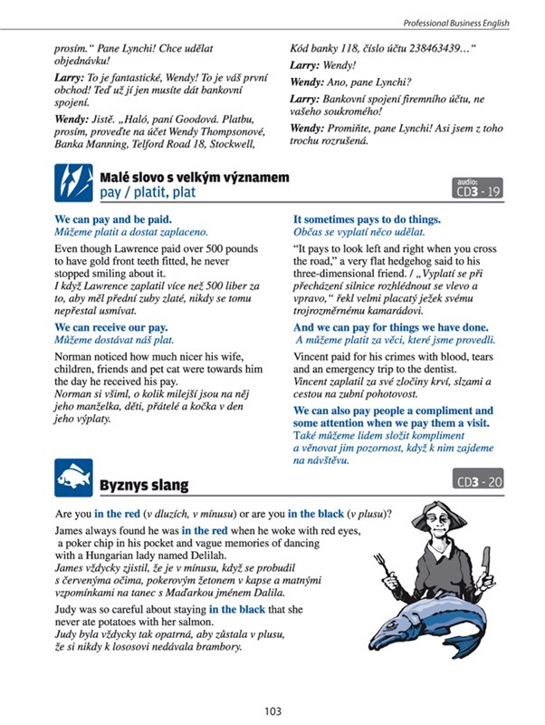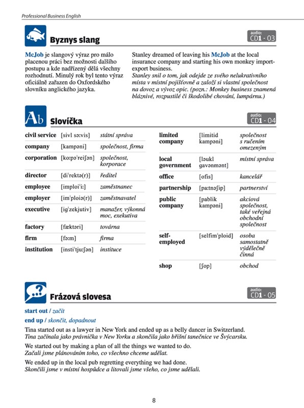 Tři přiložená CD nabízejí audio- i videolekce. Obsahují gramatiku z obchodního prostředí, slovník 1000 finančních slov, obchodní komunikaci i korespondenci v angličtině.