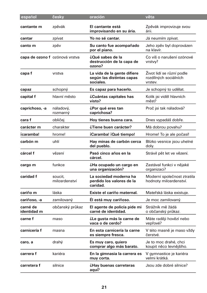 Příručka a 6 AUDIO CD jsou určeny pro studenty španělštiny ať již jde o začátečníky nebo středně pokročilé. Španělská slovíčka jsou v knize řazena abecedně. Za každým z nich je uveden český překlad, následuje typická španělské fráze s překladem, aby si čtenář upevnil zařazení a smysl daného výrazu. Uvědomí si tak vazby a kontext, jak bývá dané slovo nejčastěji užíváno.