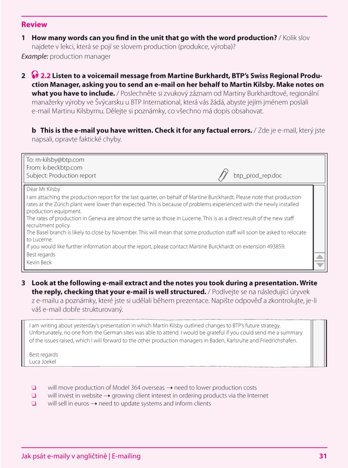 V několika lekcích proberete nejdůležitější anglickou e-mailovou terminologii a etiketu, dozvíte se, čím nejlépe začít a čím skončit e-mail, jak uspořádat zprávu, aby působila efektivně, jak vybrat správnou míru formálnosti. Učebnice vás také upozorní na typické gramatické, lexikální a interpunkční chyby.