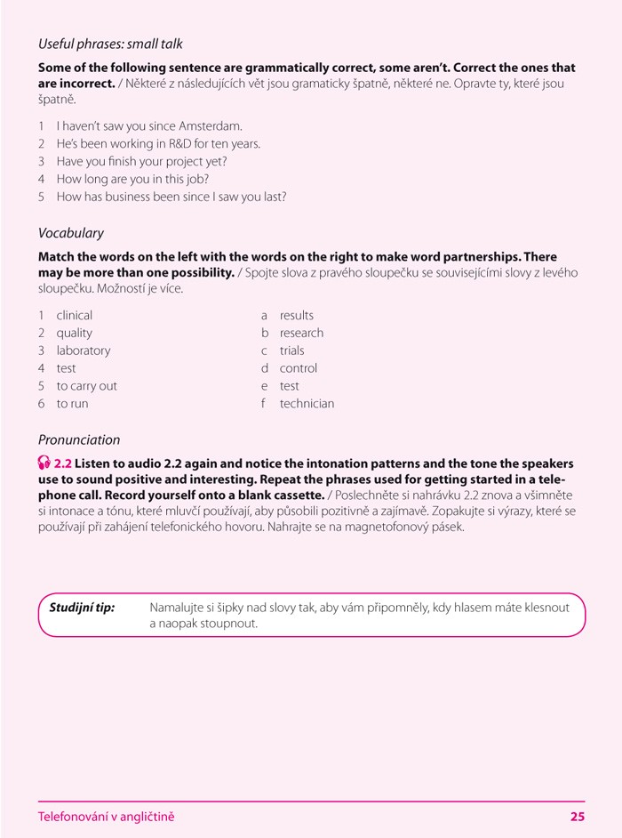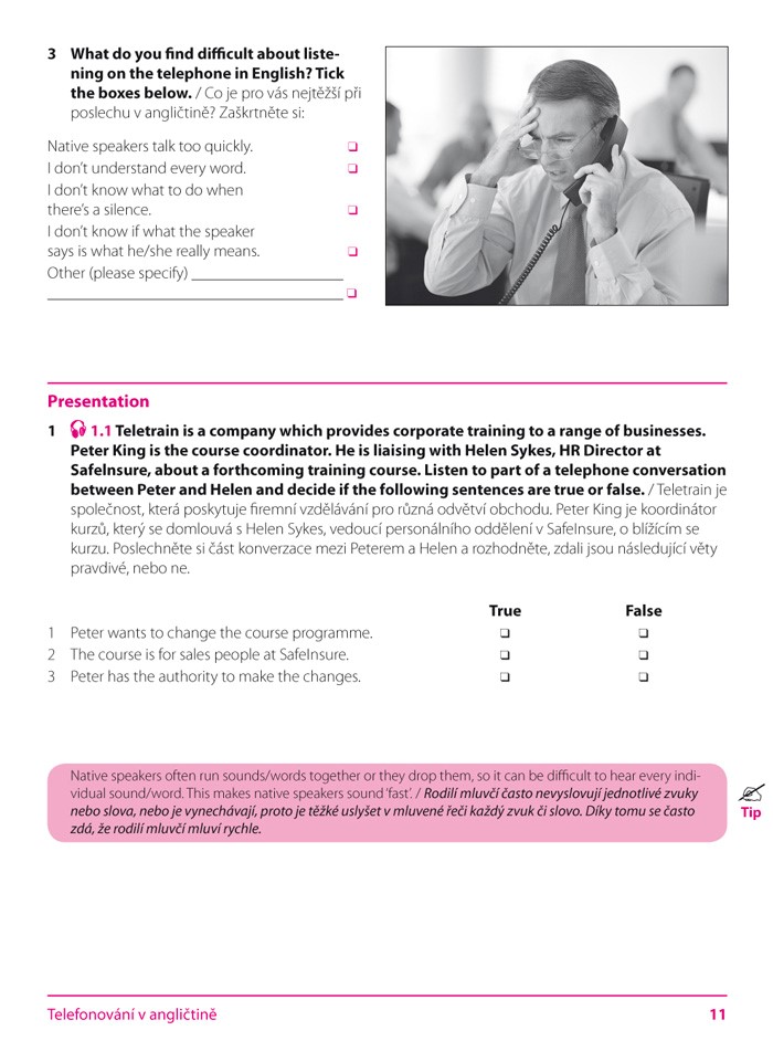 Na přiloženém audio CD najdete ukázky běžných telefonátů a vzkazů na záznamníku, které budete vyřizovat v práci. Publikace je ideální příručkou pro samouky, ale díky množství praktických cvičení bude užitečná i pro výuku v konverzačních kurzech nebo kurzech obchodní angličtiny.
