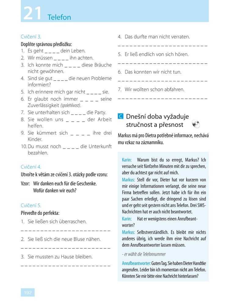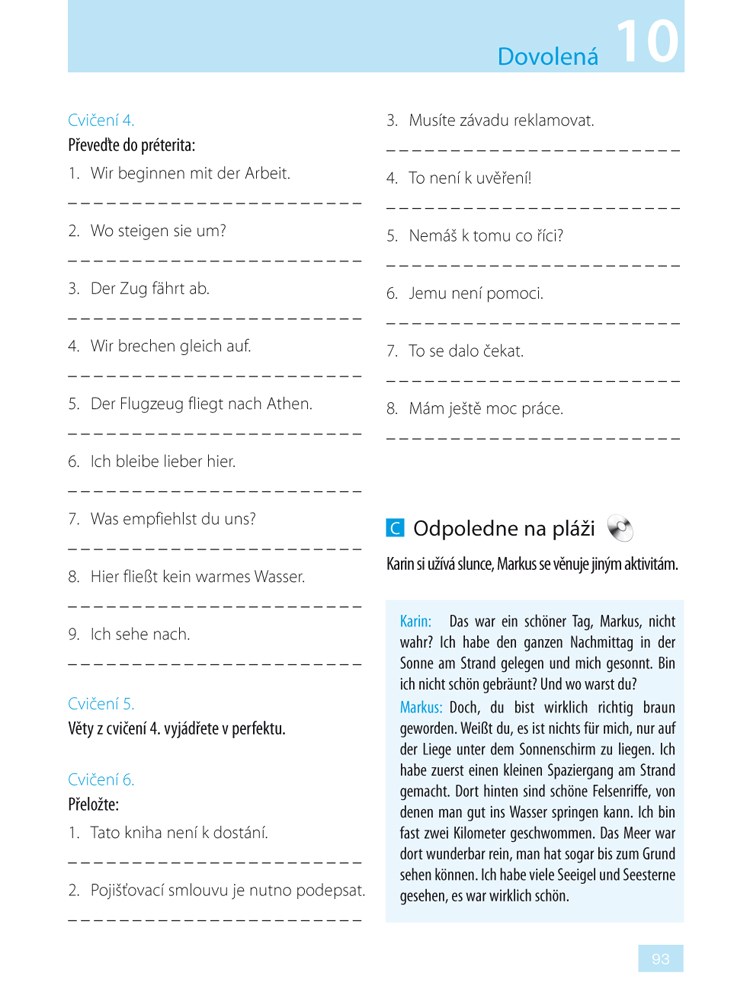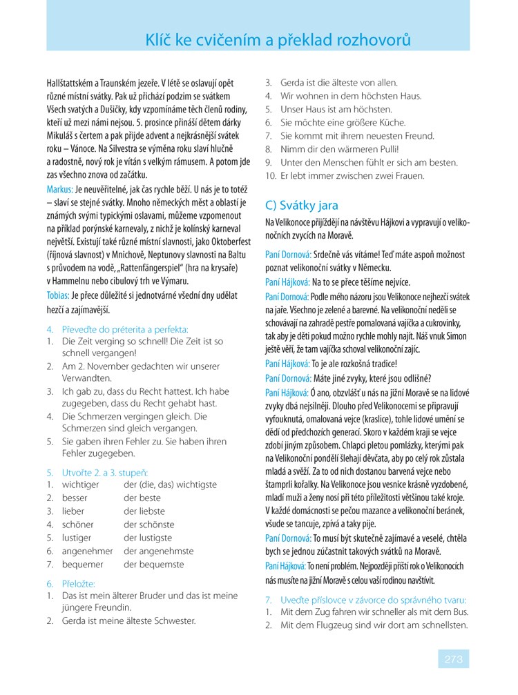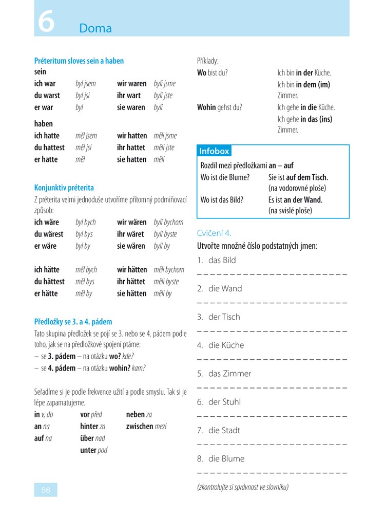 Ve 24 lekcích se seznámíte se základní německou mluvnicí i s náročnějšími tvary tak, abyste byli připraveni se německy nejen domluvit, ale také porozumět mluvenému a psanému textu. V rozhovorech vás ústřední dvojice Karin a Markus, jejich rodiny i přátelé zavedou do různých prostředí. Budete s nimi prožívat jejich radosti a starosti v rozmanitých situacích denního života, při rodinných oslavách, na cestách, na dovolené, při nakupování nebo v zaměstnání, při vyřizování různých úředních i osobních záležitostí. Zároveň budete mít možnost získané vědomosti procvičit prostřednictvím různých cvičení, překladů, otázek a hádanek. Řešení můžete zapisovat přímo do knihy, která je uspořádána zčásti jako pracovní sešit. Správné odpovědi a také překlad rozhovorů najdete v závěru publikace.