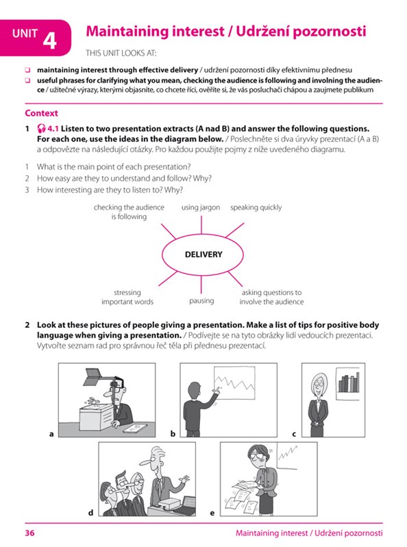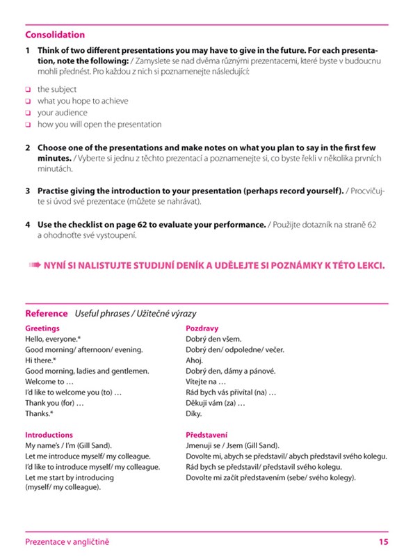 Cílem této publikace je naučit mírně pokročilé uživatele AJ nejdůležitějším postupům a technikám, které jsou potřebné k vedení kvalitní a úspěšné prezentace. Dozvíte se, jak prezentaci zahájit, jak získat pozornost publika, jak popsat grafy, tabulky a pracovat se speciálním technickým zařízením, jak svůj přednes zakončit a vhodně zodpovědět dotazy posluchačů.