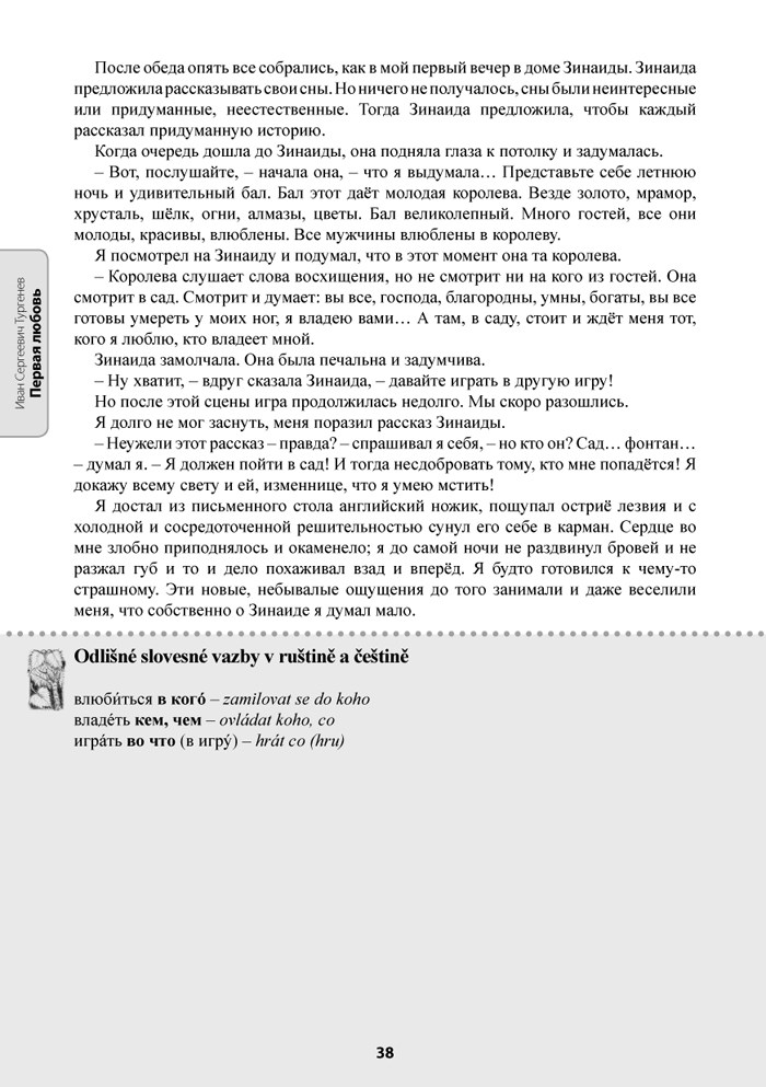 Kniha obsahuje následující povídky: A. P. Čechov „Dáma s psíčkem“, I. S. Turgeněv „První láska“, A. S. Puškin „Dubrovskij“. Pořadí povídek je odstupňováno podle obtížnosti textů jak po stránce lexikální, tak i stylistické. Texty jsou výbornou variantou pro čtenáře, kteří nemají zkušenost s jazykovými specifiky ruské klasické literatury.