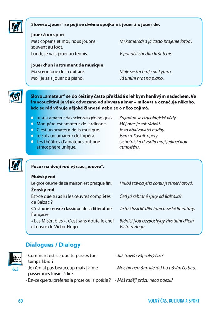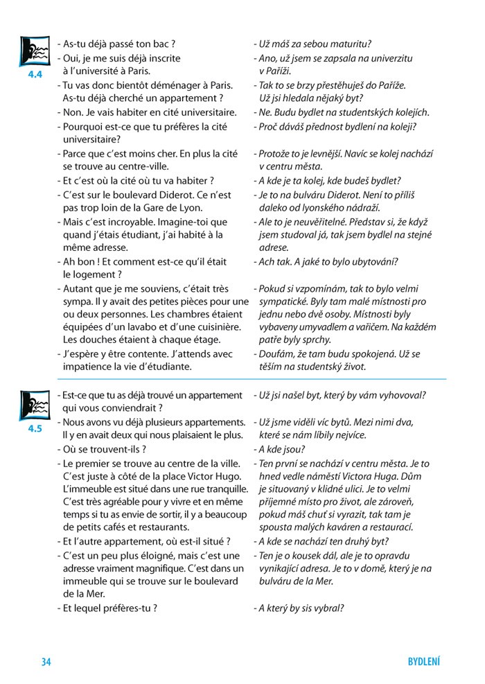 Ve dvanácti lekcích se seznámíte s nejdůležitějšími konverzačními tématy a reálnými situacemi. V každé lekci najdete slovní zásobu k danému tématu, fráze, jazykové tipy a rady. Slovní zásoba i fráze čerpají ze současného jazyka, a tak si můžete být jisti, že se učíte výrazy, které se skutečně v běžné řeči používají. Řada zábavných dialogů přispěje k osvojení a upevnění nové slovní zásoby. Kromě toho se pomocí českého překladu rozhovorů můžete snadno naučit další užitečné výrazy. Cvičení na konci každé lekce pomohou ověřit, jestli jste zvládli probranou látku a jestli jste schopni čelit reálným situacím ve francouzsky mluvícím prostředí. Řešení cvičení a přepisy nahrávek najdete v každé lekci hned za cvičeními. Do textů učebnice jsou nenásilnou formou zapracovány francouzské reálie.
