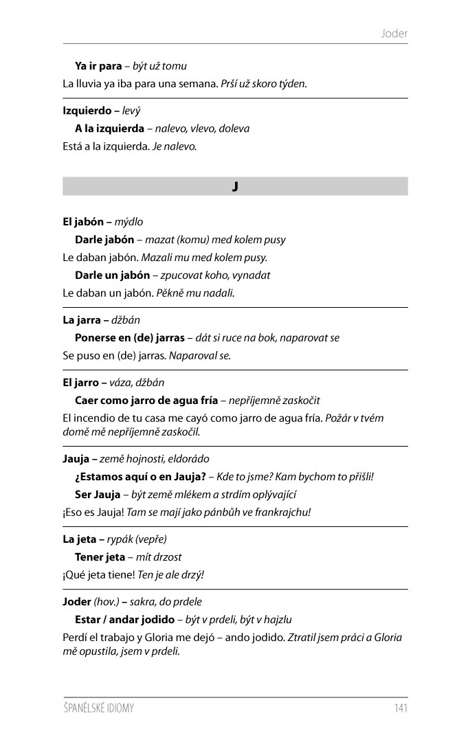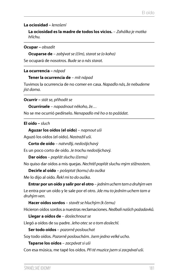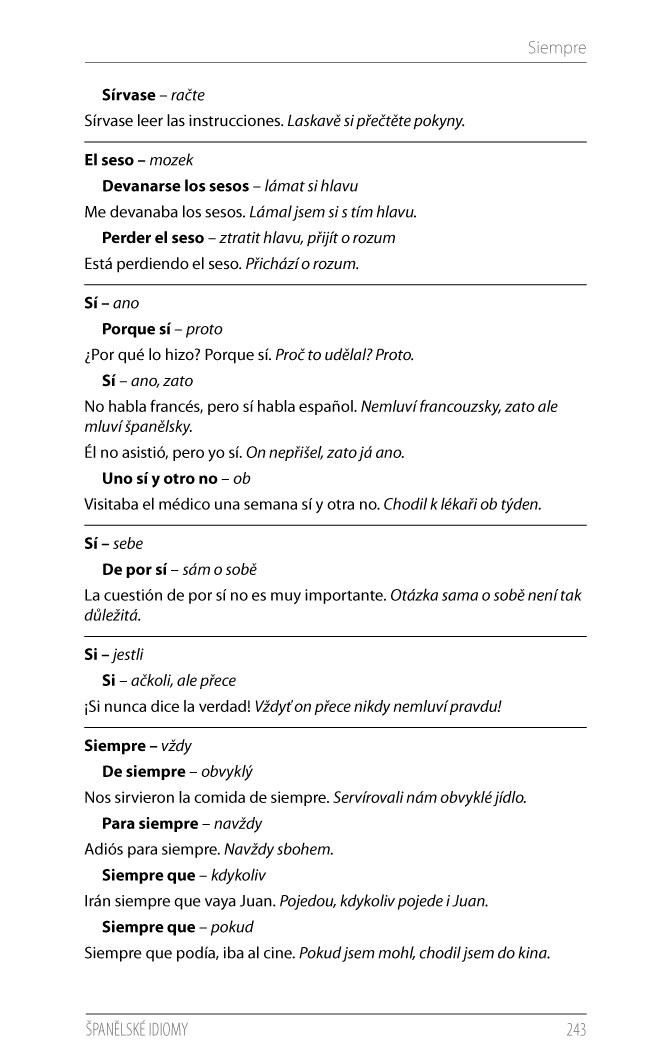 Idiomy, neboli ustálená spojení slov, které se často nedají doslovně přeložit, bez pochyby patří mezi tzv. překladatelské oříšky, s kterými mohou mít problém i pokročilí studenti. Hledání takových výrazů ve velkých slovnících španělštiny může zabrat hodně času, na druhou stranu kapesní slovníky obvykle nechávají malý prostor pro idiomy. Je tedy mnohem snazší nahlédnout do příručky, která nabízí kolem 2500 idiomatických obratů ze současného španělského jazyka. Výrazy jsou seřazeny abecedně dle klíčového slova, od kterého se fráze odvíjí. Každý idiomatický výraz je opatřen vzorovou větou s českým překladem. V závěru publikace se nachází praktický rejstřík, díky kterému rychle najdete potřebný výraz, a také seznam běžných španělských zkratek s významem a českými ekvivalenty. Publikace je vhodnou pomůckou pro všechny zájemce o španělský jazyk. Najdete v ní odpovědi a vysvětlení i těch nejzáludnějších idiomatických vazeb.