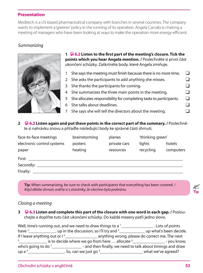 Na přiloženém audio CD najdete ukázky rozhovorů, diskuzí a telefonátů z obchodního prostředí, které poslouží jako šablony či osnova pro přípravu vlastních obchodních schůzek v angličtině.