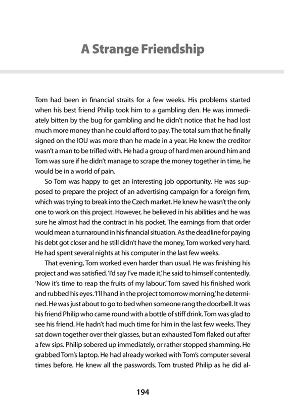 Kniha vznikla ze skutečných životních příběhů a je určena pokročilým studentům. Cílem je pomoci čtenářům zopakovat si četbou i poslechem znalosti a prohlubovat je osvojením si frází a slovních obratů. Titul lze používat jako doplňkový materiál pro skupinovou výuku, ale je vhodný i pro samouky. Povídky jsou doplněny českou verzí a řadou cvičení pro porozumění četbě i poslechu. Každou povídku provází vysvětlení gramatických jevů, jež jsou dále prezentovány v gramatických cvičeních.