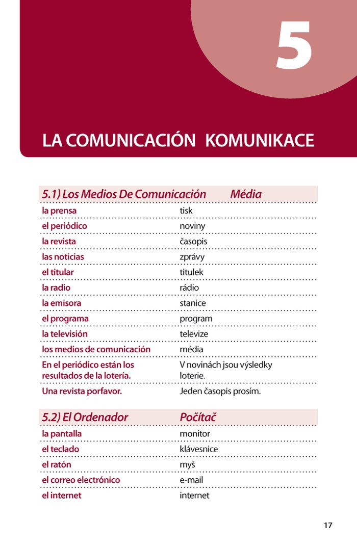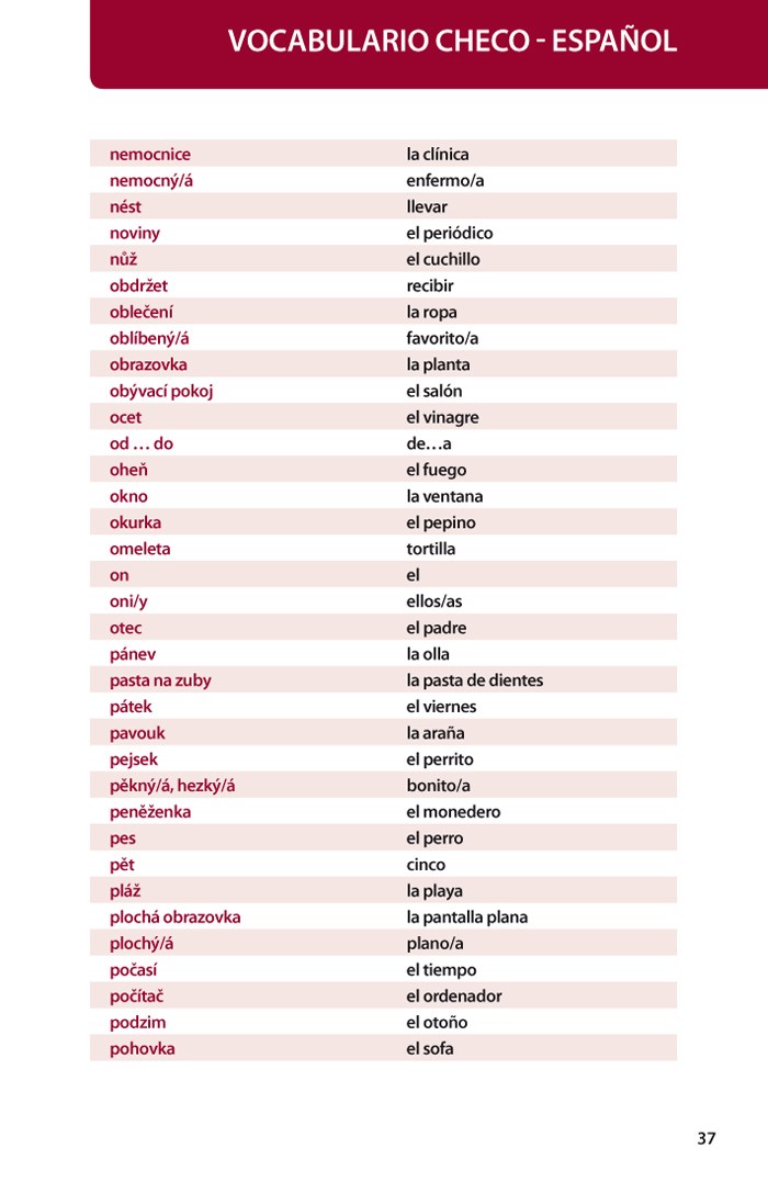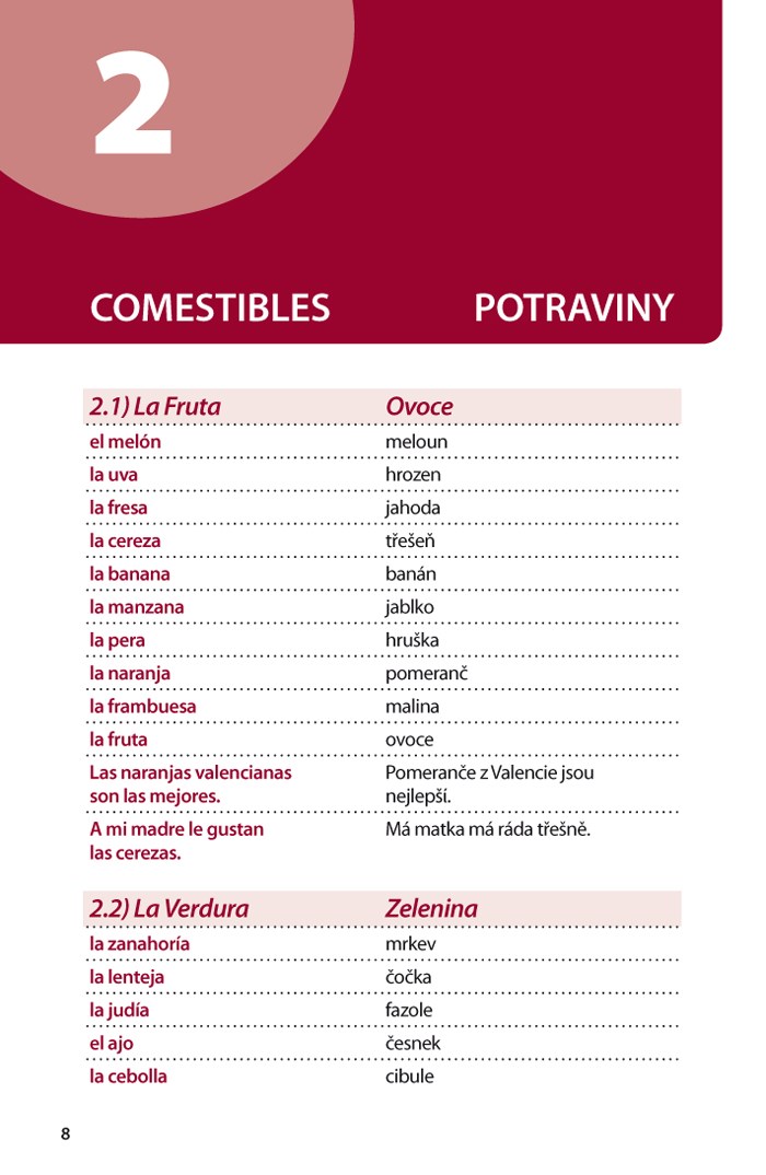 Za každým španělským slovíčkem následuje český ekvivalent, na konci tematického okruhu pak leží typické španělské fráze, opět s překladem.