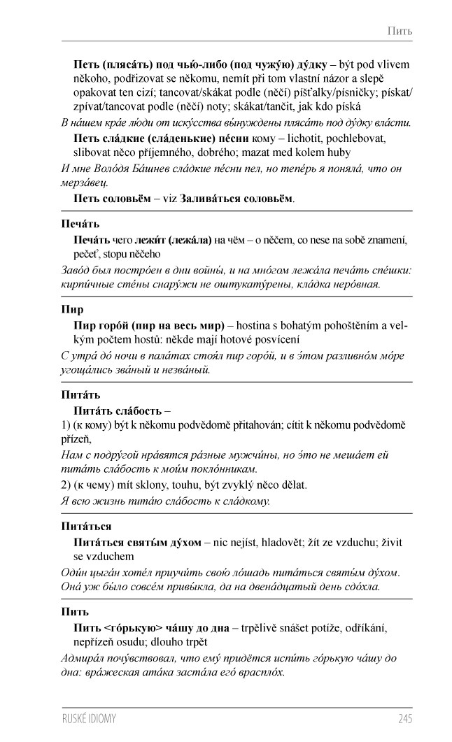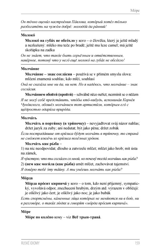 Idiomy neboli ustálená spojení slov, která se často nedají doslovně přeložit, bezpochyby patří mezi tak zvané překladatelské oříšky, s kterými mohou mít problém i pokročilí studenti. Hledání takových výrazů ve velkých slovnících může zabrat hodně času, na druhou stranu kapesní slovníky obvykle nechávají pro idiomy malý prostor. Je tedy mnohem snazší nahlédnout do příručky, která vám nabízí více než 4000 idiomatických obratů ze současného ruského jazyka.
