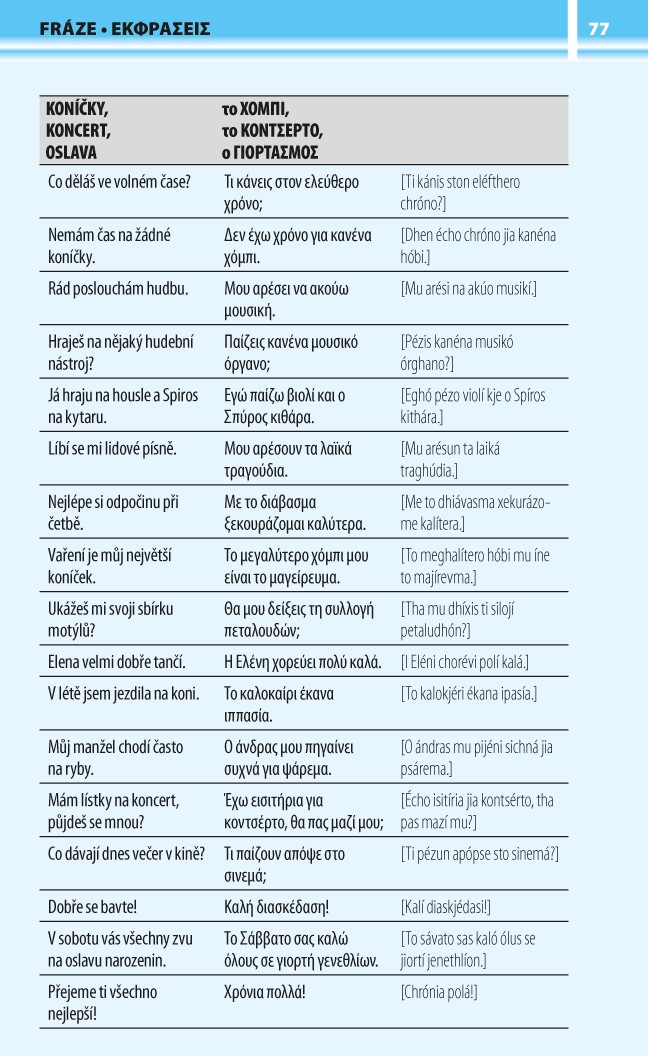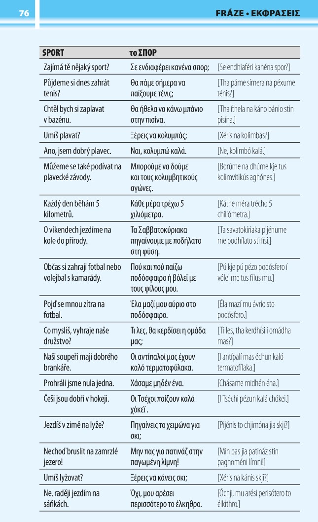 Každý tematický celek je doplněn typickými frázemi. Na konci knihy se nachází souhrnný slovníček.