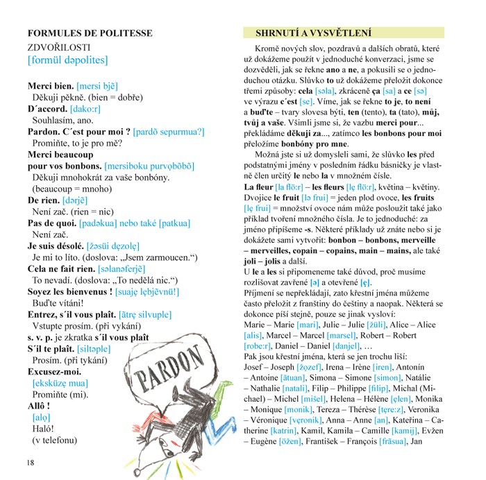 Kniha poskytuje základní orientaci ve francouzském jazyku. Témata jsou řazena dle každodenní potřeby; slova, výrazy a věty jsou doprovázeny fonetickými symboly nezbytnými pro osvojení správné výslovnosti. Stručná vysvětlení, gramatická a obecně kulturní, jsou jasná a přesná, doplňují je četné příklady a cvičení s nabídkou správného řešení úkolů.