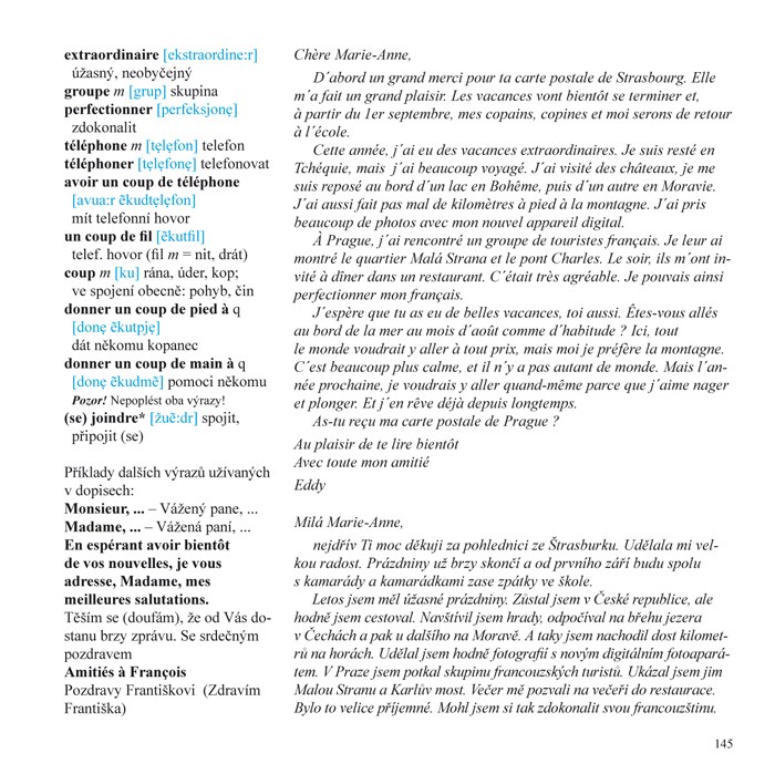 Jazyk, jenž kniha nabízí, má standardní úroveň. Je moderní, použitelný v jazykové komunikaci v úrovni A2–B1 podle kritérií «Cadre Européen Commun de Référence pour les langues étrangères». Danièle Geffroy Konštacký