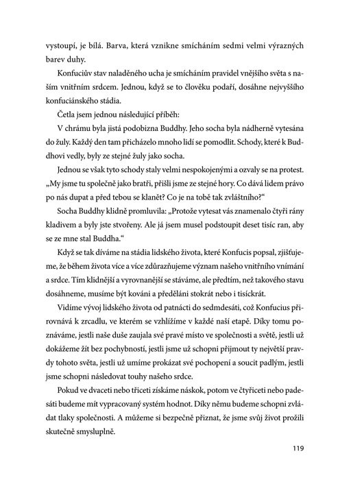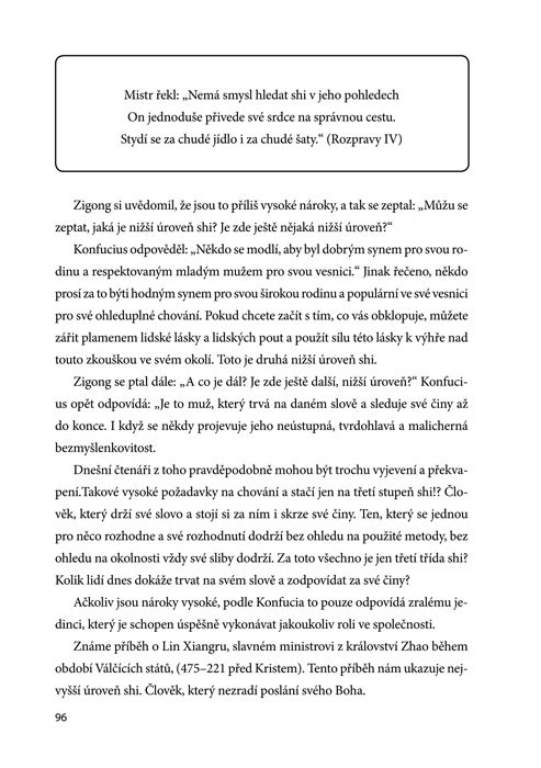 A jaký je jeho praktický význam pro naši společnost dnes? Po dlouhé věky se lidé nořili do konfuciánských myšlenek, a přestože bylo jejich vnímání rozdílné, všichni byli nakonec dovedeni ke stejnému cíli. V Číně se říká: „Pravda nebyla nikdy daleko od obyčejných lidí.“ Ti, kdo jsou schopni přijmout osvícení v podobě chvilkového zastavení srdce, při kterém vás zaplaví vlna pochopení, objeví přínos Konfuciova učení. To, co Konfucius nabízí dnes, není posvátné, důstojné a obřadní konfuciánské náboženství, ale jednoduché pravdy, které může každý člověk najít ve svém srdci. Z mého pohledu moudrost Konfucia nespálí vaše ruce, ani není ledově mrazivá. Má přesně teplotu vašeho srdce, která je stejná po celá staletí.