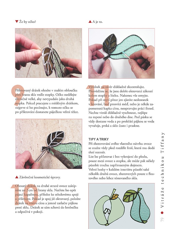 Zkušené lektorky výtvarných kurzů vám představují výrobu vitráží technikou Tiffany. Provedou vás tímto řemeslem krok po kroku stejně jako byste byli účastníky jejich kurzů – vědí, kde jsou technická úskalí obtížná pro začátečníky, předem odpovídají na otázky, které vás při tvorbě napadají. Dozvíte se, kde a jaká skla a ostatní pomůcky nakoupit, jak správně řezat do skla, obeznámí vás také s nezbytnými bezpečnostními předpisy. A to vše s humorem sobě vlastním!