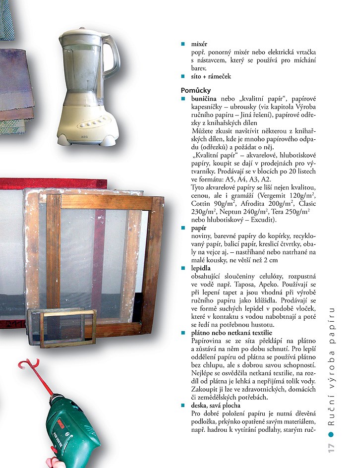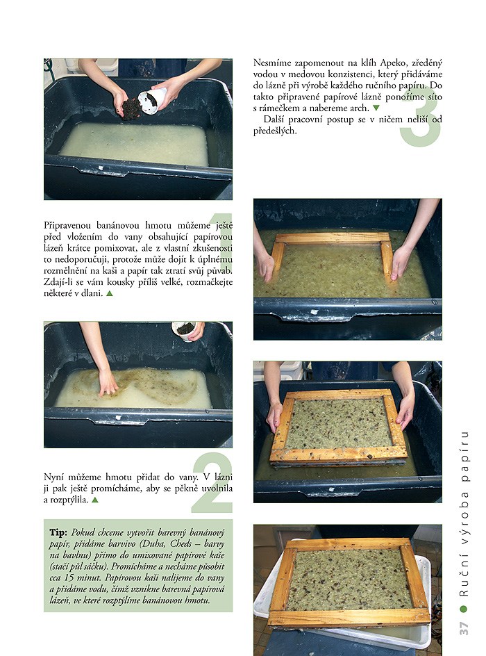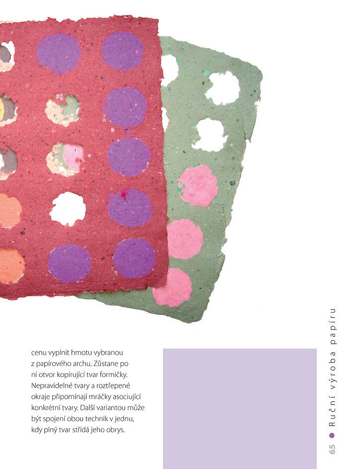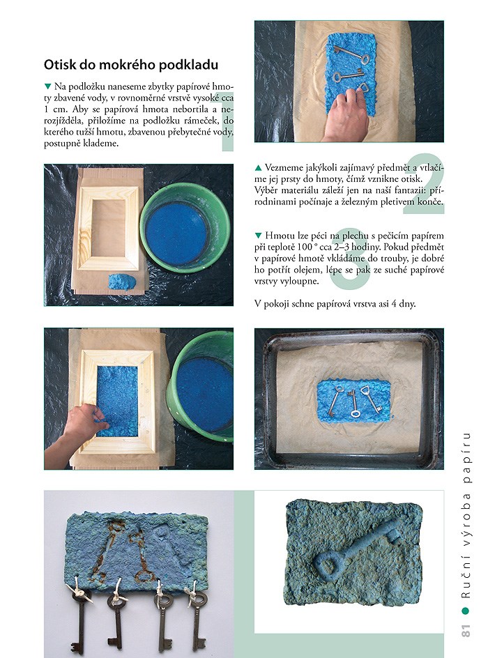 Chcete-li si vytvořit vlastní originální dopisní, dárkový či upomínkový papír, otevřete naši knihu. Autorka vás provede jeho výrobou od výběru pomůcek až po využití hotového papíru pro další tvorbu. Zhotovíte si síto na ruční čerpání papíru, naučíte se používat přírodní materiály, barvit papír syntetickými i přírodními barvivy a tvořit vzory pomocí formiček. Postupně se propracujete až k dvouvrstvému papíru, kreslení, papírovým „vitrážím“ a prostorovým technikám práce s ručním papírem jako je reliéf a otisk. Na závěr se dozvíte jak si vyrobit z vlastního papíru zápisník či knihu se šitou nebo lepenou vazbou.