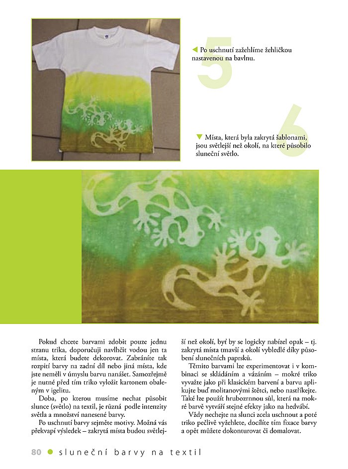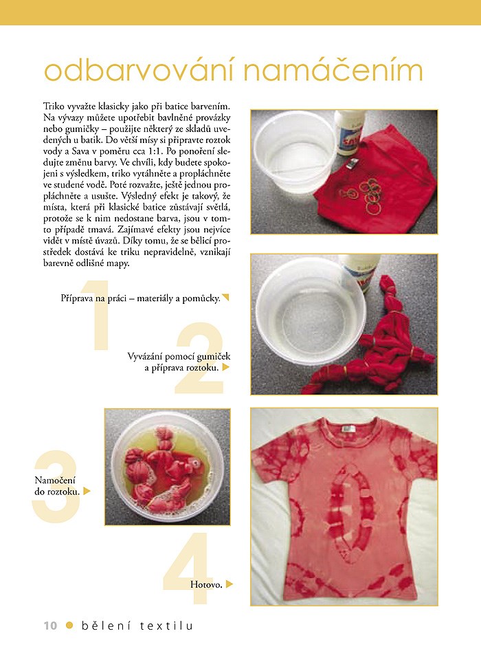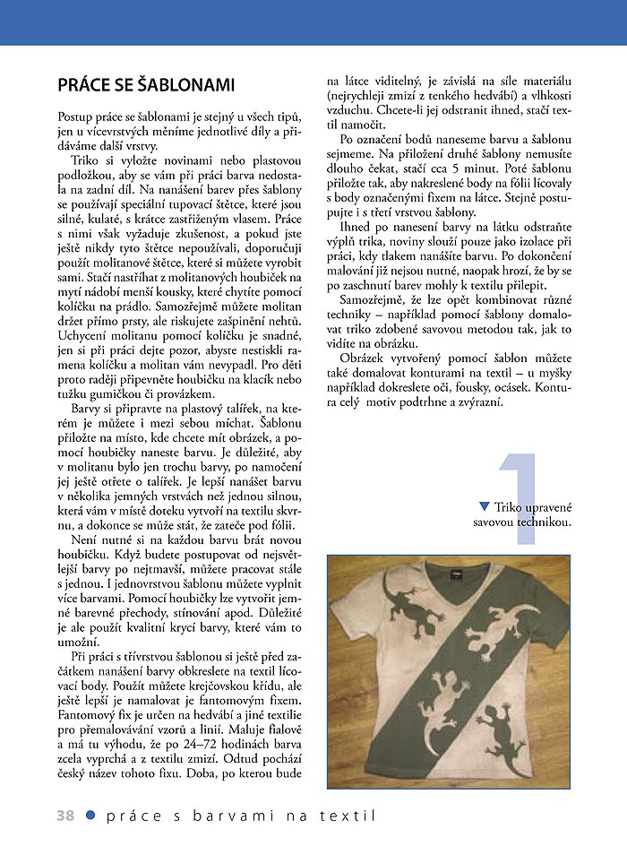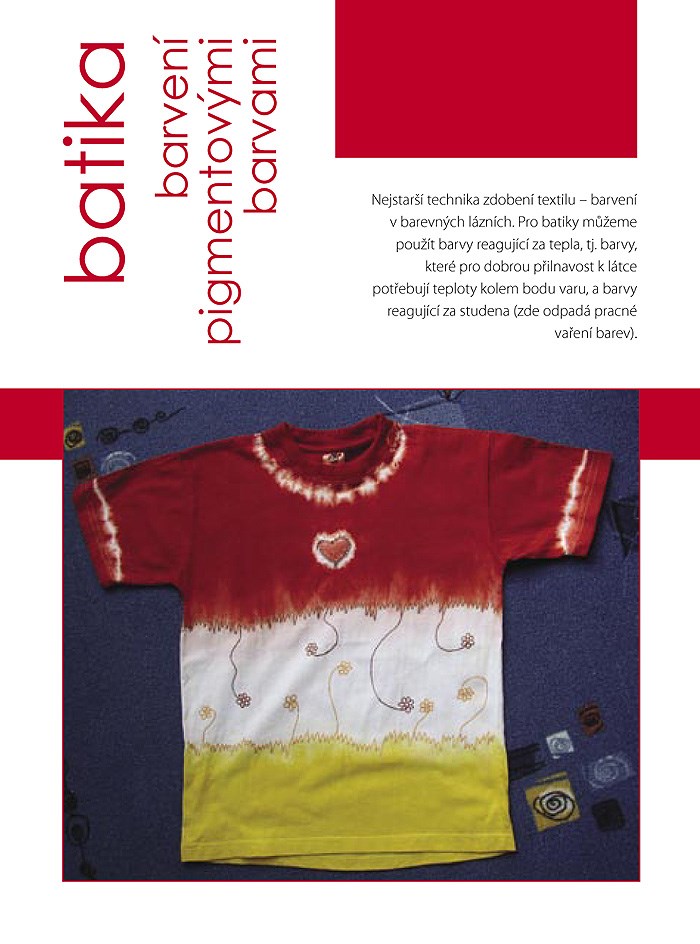 Patříte-li k těm, kteří se v oblékání rádi liší od ostatních, nabízí vám autorka této publikace více než sto nápadů na vytvoření originálního trička pomocí různých technik jako je bělení textilu, práce s barvami na hedvábí a na textil, obtiskování, malování, nanášení přes šablony, textilní aplikace, prostřihování, různé druhy batikování, využití snímatelných a také slunečních barev na textil. V závěru knihy nechybí hotové šablony, které stačí jen přenést a začít tvořit. Motivy a vzory, které s touto knihou objevíte můžete samozřejmě dále rozvíjet a pořídit si tak nejen zajímavé tričko, ale i další kousky do vašeho šatníku.