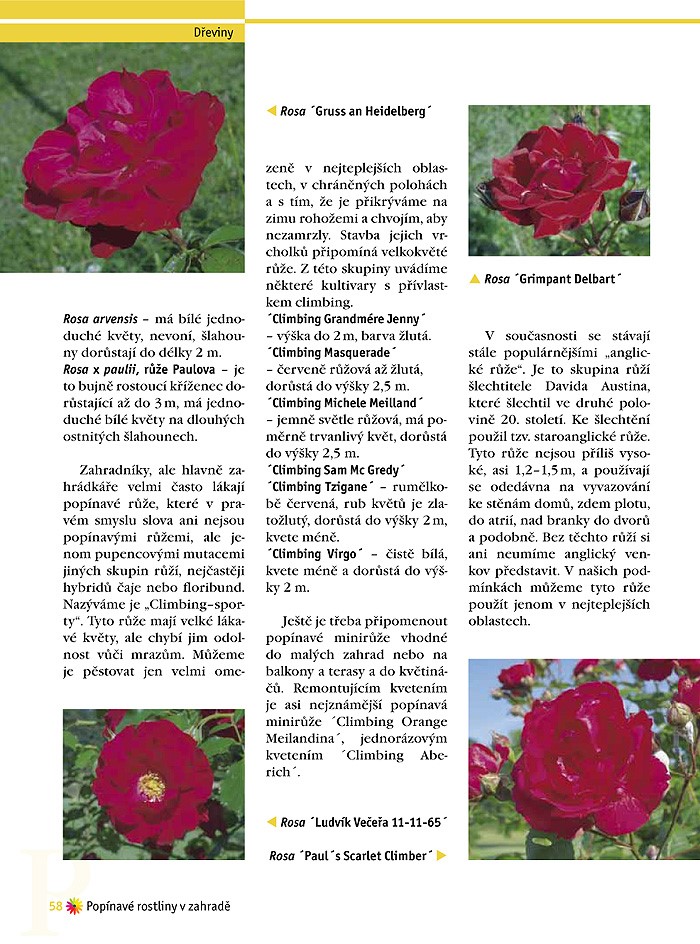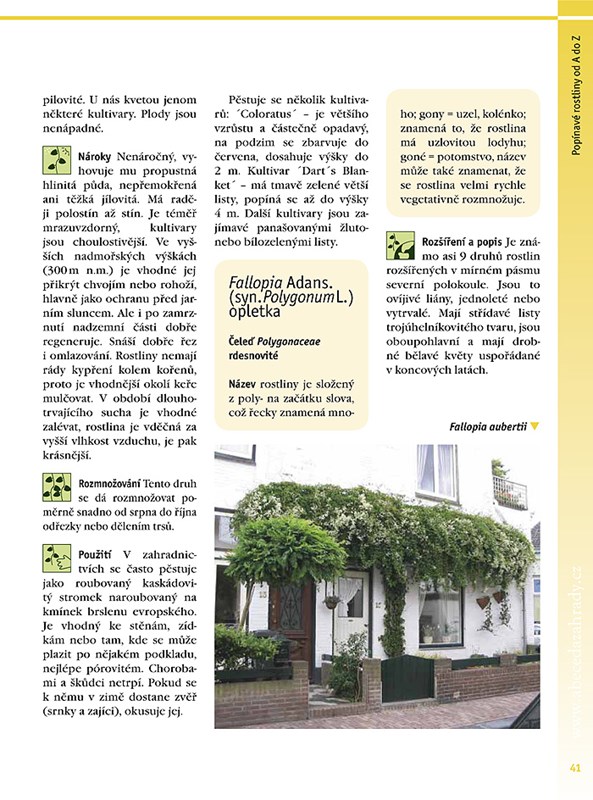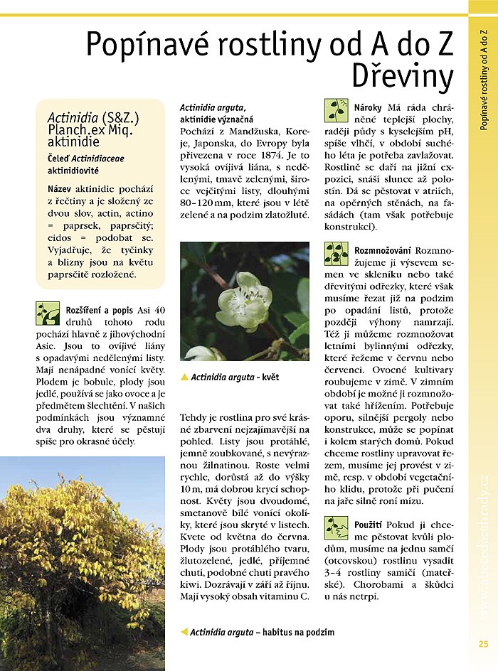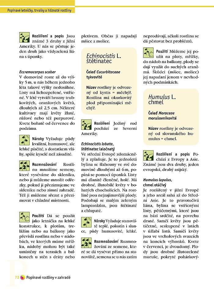 Tato publikace by měla být manuálem, návodem na zorientování se v sortimentu těch popínavých rostlin, které jsou v našich klimatických podmínkách použitelné. Rostliny jsou rozděleny na dřeviny, které jsou na daném stanovišti vytrvalé, a na byliny, které používáme v našich podmínkách jako letničky. U každé rostliny je v krátkosti popsán způsob rozmnožování, nejvhodnější stanoviště z hlediska světelných a půdních podmínek, zvláštnosti rostliny a možnosti jejího uplatnění. Na konci publikace jsou všechny rostliny uspořádané do přehledných tabulek.