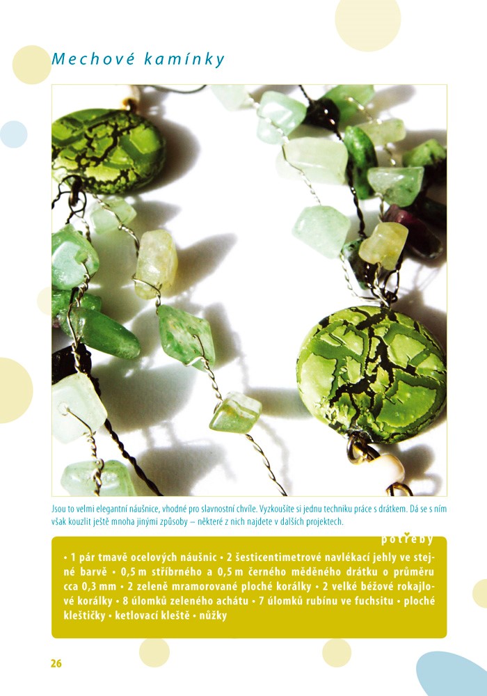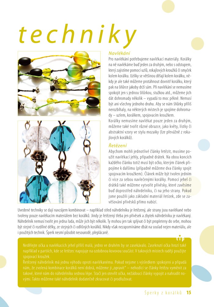 Vyberte si ty správné korálky a další potřeby pro navlékání a zhotovte si osobité a elegantní šperky. V první kapitole se dozvíte, jak rozmanité mohou korálky být a z jakých materiálů se vyrábí, další část je věnována ostatním druhům materiálu, bez kterých se při tvorbě neobejdete. Osvojíte si základní techniky a pak se můžete dát do vlastní tvorby podle fotografických návodů. Autorka vás povede krok za krokem projekty, díky nimž vaši klenotnici obohatíte o nejrůznější náušnice, náhrdelníky, náramky, prsteny i sponu do vlasů.