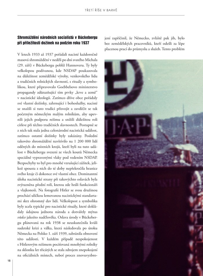 Fotografických publikací o nacistickém Německu a druhé světové válce vyšlo mnoho. Třetí říše v barvě od Jill Stephenson je unikátní v tom, že nabízí pohled na tehdejší dobu prostřednictvím dobových barevných fotografií. Je přitom poměrně málo známé, že barevná fotografie existovala už ve třicátých letech. Používala se však jen velmi zřídka. Každá dochovaná barevná fotografie je proto velmi vzácná. Zachycuje nejen děj, ale i tehdejší atmosféru. Text publikace je zaměřen na nacistickou propagandu, její nástroje a triky. Právě barvy v ní hrály významnou úlohu.