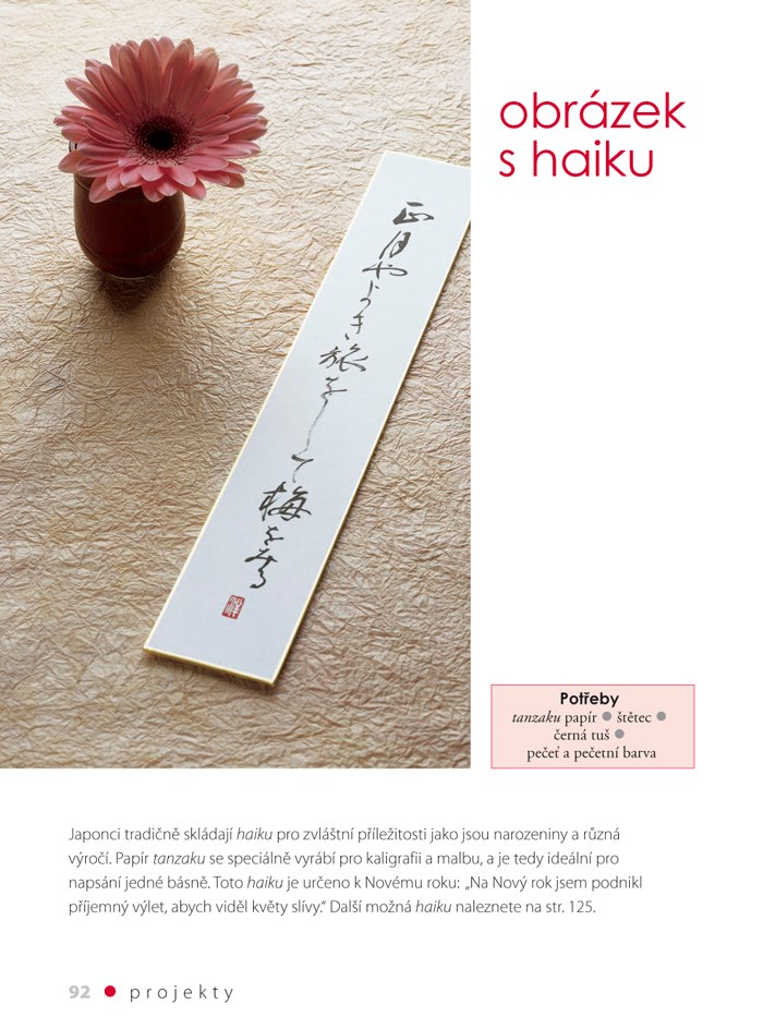 Vytvořte jedinečné dárky, přáníčka a dekorativní předměty, které v sobě mají elegantní a mnoho století staré umění japonské kaligrafie. Poté, co si osvojíte základní techniky práce se štětcem a tuší a naučíte se psát japonské piktogramy a fonetické znaky, budete se moci pustit do patnácti krásných projektů využívajících papír, keramickou hlínu, textil a také oblázky. V knize naleznete vzory pro psaní křestních jmen, řadu přání, myšlenek a básní včetně haiku a zenových přísloví.