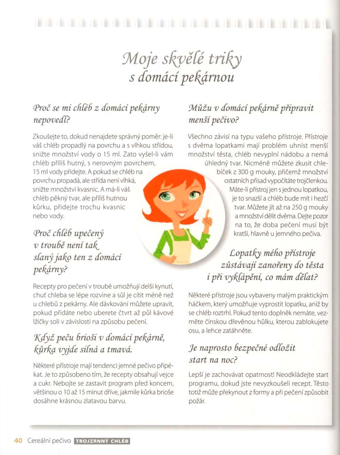 Kniha plná praktických rad a spousty lahodných receptů pro každého, kdo chce začít používat domácí pekárnu. Seznamí vás s možnými ingrediencemi, pomůckami, vlastnostmi domácí pekárny. Naleznete zde také praktické tipy, aby se vám pečení co nejlépe dařilo.
