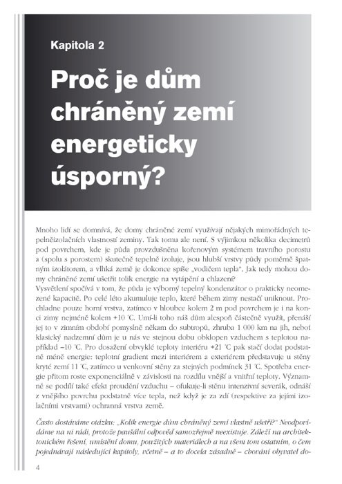 Renomovaný autor v knize popisuje, jakými způsoby se takové domy staví, výhody jednotlivých technologií, ale také jejich možná rizika. Zvláštní kapitoly jsou věnovány izolacím, řešení osvětlení jednotlivých místností v domě, vytápění, chlazení a větrání interiéru. Text obohacují praktické zkušenosti a příklady výstavby domů krytých zemí v České republice i v zahraničí.