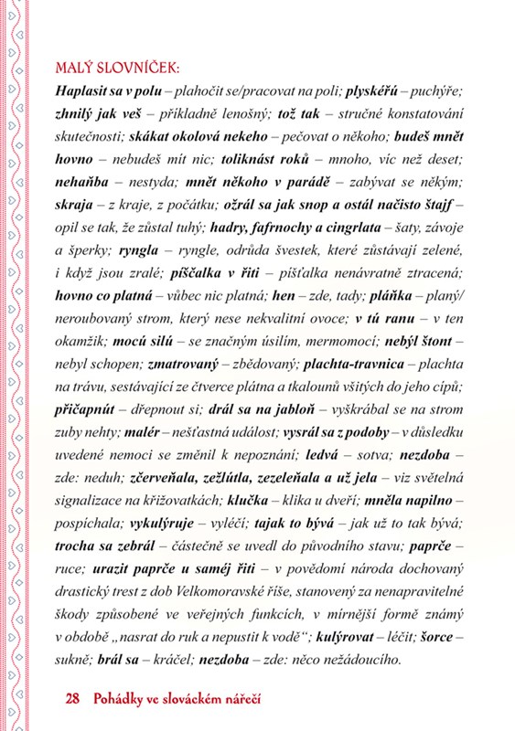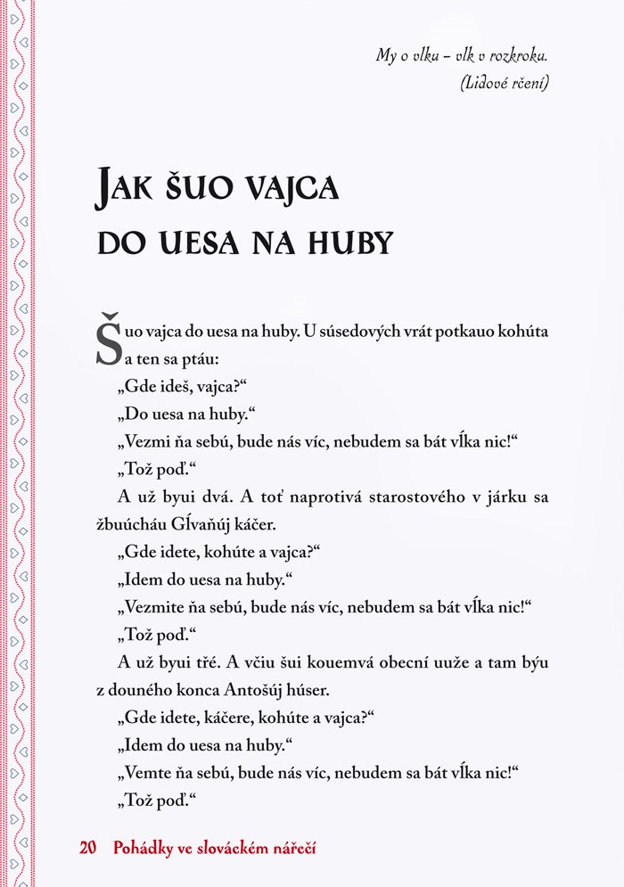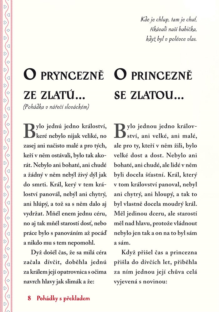 Pokud vám rovněž přijde vysoce nepravděpodobné, že Popelka ztratila na plese zrovna střevíček, princeznu na hrášku tlačil přes stovku prachových peřin jen ten jeden maličký hrášek a nad zlato musí být ceněna vždycky jenom sůl, je tato netradiční pohádková kniha, kde je většina příběhů vyprávěna ve stylu českých krajových nářečí (slovácké, hanácké a chodské), určena přímo pro vás.