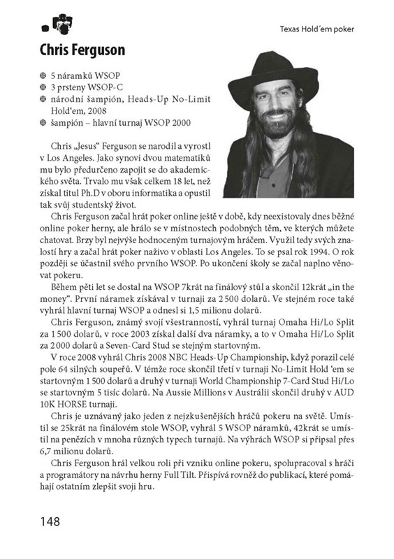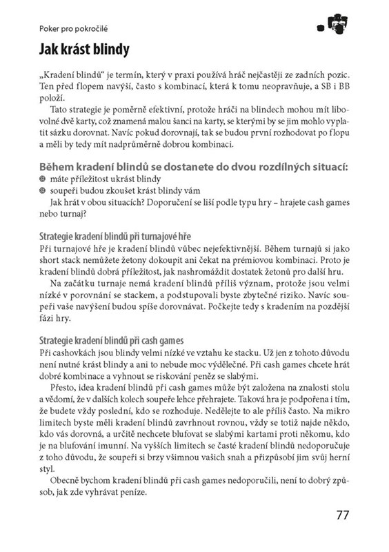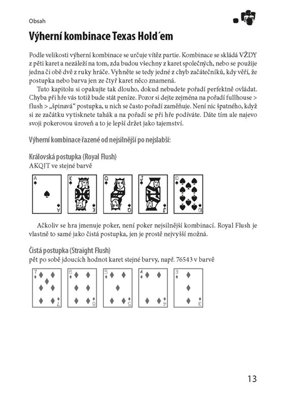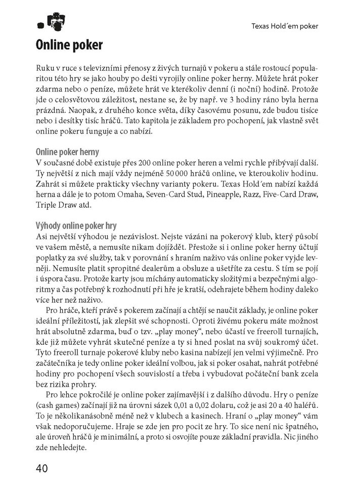 Tato přehledná publikace vás provede vzrušujícím světem Texas Hold´em Pokeru a pomůže vám stát se lepším hráčem než vaši soupeři. Naučíte se pravidla a získáte základní předpoklady pro ziskovou hru, osvojíte si zásady bankroll managementu a seznámíte se s pojmy jako Pot Odds či Pot Outs. Dozvíte se i cenné informace o technikách, které používají zkušení pokeroví hráči, uplatníte psychologické zbraně při blufování a poznáte herní strategie pro konkrétní typy turnajů. V knize rovněž naleznete profily nejlepších hráčů světa, hodnocení největších online heren a výčet českých pokerových klubů.