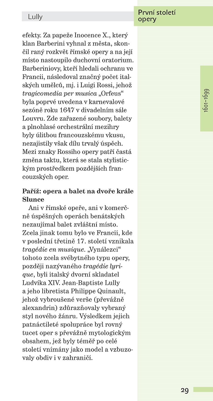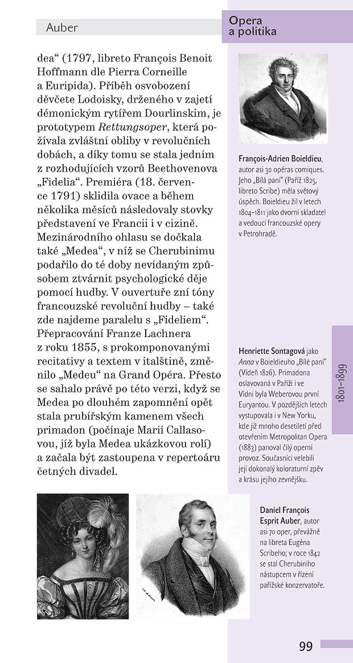 Chronologický výklad je prokládán medailony nejvýznamnějších skladatelů a množstvím barevných vyobrazení, které vytvářejí jakýsi paralelní komentář. Čtenář se dozví mnohé také o nejvýznamnějších operních primadonách a kultech s operou spojených.