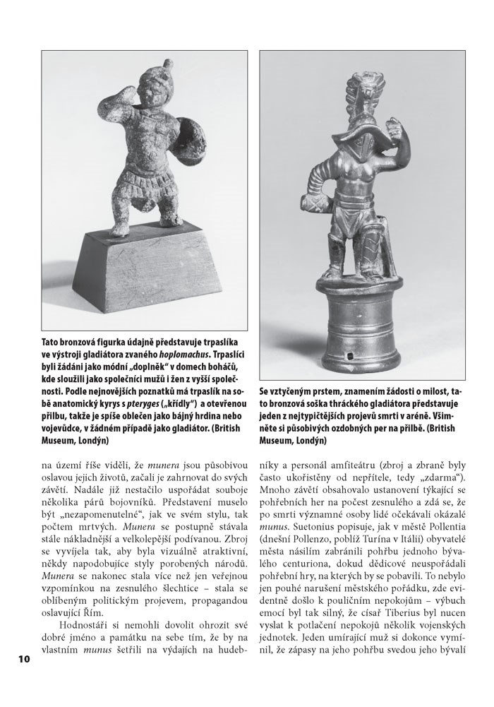 Gladiátorské hry římského světa zahrnovaly bitvy pro zábavu a zabíjení pro zisk. Ačkoli neblaze prosluly využíváním válečných zajatců, otroků a odsouzených zločinců, přesto se našli i dobrovolní zájemci o gladiátorskou profesi. Atraktivní podívaná byla nade vše: bojovníci byli povzbuzováni k prolévání krve protivníka a prodloužení jeho utrpení. Pro občany i císaře předváděli gladiátoři drama plné násilí – a publikum je za to milovalo. Tato kniha rozebírá, jak se muži – a také ženy – ocitli v aréně. Podrobně rovněž popisuje různé typy gladiátorů, jejich výzbroj a výstroj, jaký byl jejich každodenní život a výcvik – a jak vše vyvrcholilo vstupem do arény.
