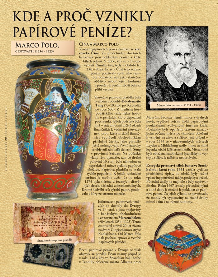 Vstupte do dějin naší země a podívejte se, ve které době se užívaly jaké peníze. Naše publikace vás povede chronologicky od počátku, kdy ještě fungoval směnný obchod, všimne si mincí keltských, denárů, které zavedli Přemyslovci, a dále po sobě nastupujících brakteátů a grošů. Zjistíte, kterými dukáty se platilo v době vlády Habsburků, kdy nastoupily tolary a kdy je nahradily zlatky a ty zase koruny.