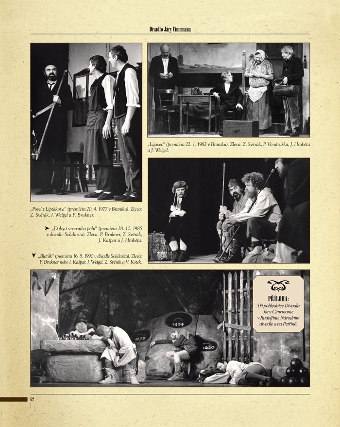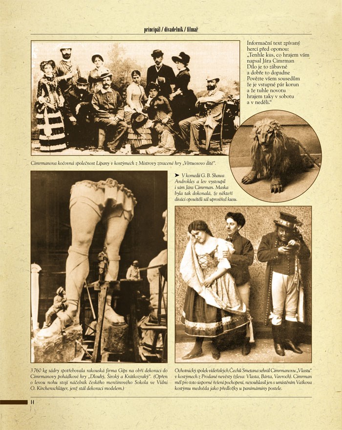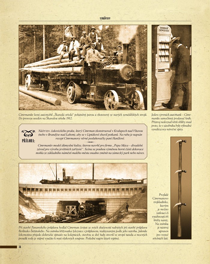 Na stránkách naší knihy se bude moci čtenář s mistrem setkat téměř osobně a to nejen prostřednictvím množství nově objevených a doposud nezveřejněných fotografií a ilustrací, ale především díky téměř 30 jedinečným dobovým dokumentům, které zná každý nadšený cimrmanolog zatím pouze z vyprávění a už hoří, co teprve, až je spatří? Mistrovy vlastnoruční poznámky a črty, nákresy geniálních vynálezů, ojedinělé notové záznamy, dokonalé plánky, podrobné mapy, dobové brožury a mnoho dalších jedinečných artefaktů, které konečně spatřují světlo světa tak, jak by si to Jára Cimrman jistě přál: totiž pod jeho jménem a v seriózní knize (s téměř koženou vazbou). Kniha například obsahuje: