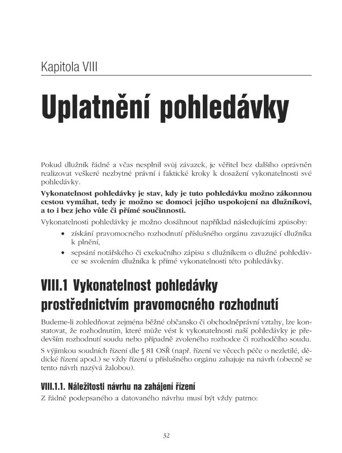 Publikace je určena všem, kteří potřebují nebo mají zájem získat ucelený přehled o pohledávkách a také závazcích, jejich výhodách i rizicích. Autoři přibližují problematiku zejména vzniku, zajištění, zániku a realizace pohledávek nejen z hlediska občanského a obchodního zákoníku, ale i dalších odvětví soukromého práva, např. rodinného a pracovního. Autoři zvolili takovou systematiku a skladbu informací, která odpovídá nárokům jak odborné, tak široké veřejnosti. Publikace podává odpovědi k jednotlivým problémům souvisejícím s pohledávkami a závazky, ilustrované množstvím příkladů z denní praxe, a proto může sloužit jako příručka řešení konkrétního případu.