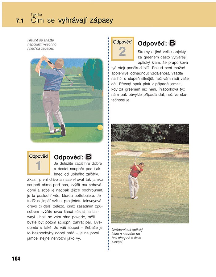Kniha vám pomůže zjistit, jak jste na tom se svými herními dovednostmi, a kolik toho víte o jejich teoretickém pozadí. Je napsána formou otázek a odpovědí, pomocí kterých vás seznámí s jednotlivými situacemi a problematickými fázemi hry, do nichž se při hře dostanete. Předkládá problémy, které s nimi souvisí, umožňuje vám o nich přemýšlet a nakonec nabízí správné odpovědi od špičkových golfových odborníků.