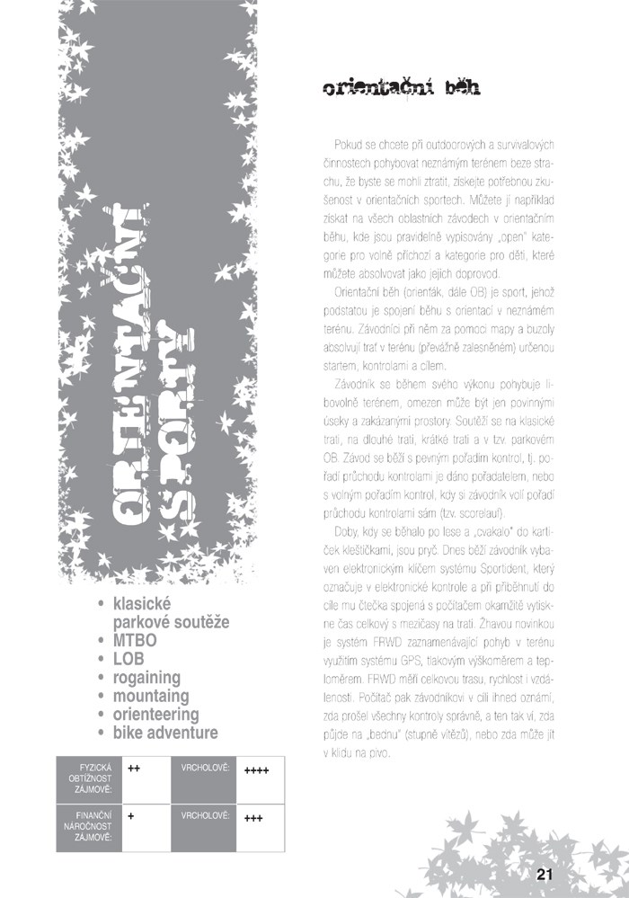 Outdoorové, survivalové aktivity a orientační sporty prochází bouřlivým vývojem. Navíc po roce 1989 došlo k nárůstu cestování do zahraničí a za poznáním. S tím souvisí objevení různých forem outdoorových činností provozovaných po celém světě a jejich rozšíření i u nás. Cílem publikace není vypracování trenérských plánů a metodik, ale seznámení s věcmi okolo, které jsou důležité nejen pro sportovní výsledek. Kniha se věnuje sportům provozovaným mimo město a sportovní haly a je tedy souborem potřebných informací pro všechny, kteří se věnují aktivitám v přírodě. Autor vám nejdříve představí hlavní outdoorové sporty a jejich disciplíny. V druhé části knihy se bude zabývat tím, jak se na takovéto činnosti a věci s jejich provozováním spojené dobře připravit.
