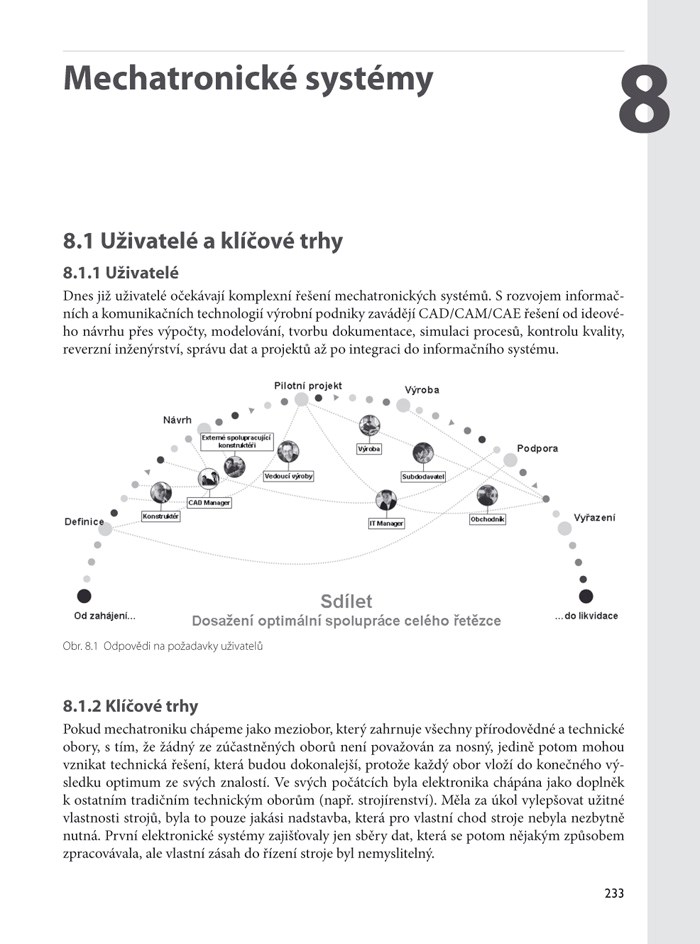 Úvodní kapitoly učebnice nejprve seznámí čtenáře se základními pojmy užívanými v tomto oboru, uvedou příklady aplikace mechatronického přístupu a objasní charakter mechatronického výrobku. Následující kapitoly podrobně proberou klíčové součástky mechatronické soustavy – senzory a akční členy, které realizují převod řídicí veličiny na mechanicky vystup. Řízení mechatronických soustav je pak věnován nemalý prostor; součástí je i seznámení s fuzzy logikou, která se uplatňuje v inteligentních řídicích systémech. Další kapitoly se věnují modernímu způsobu návrhování mechatronických soustav a na mnoha příkladech ukazují jeho výsledky. Závěr knihy je věnován spolehlivosti, diagnostice a údržbě mechatronických soustav.