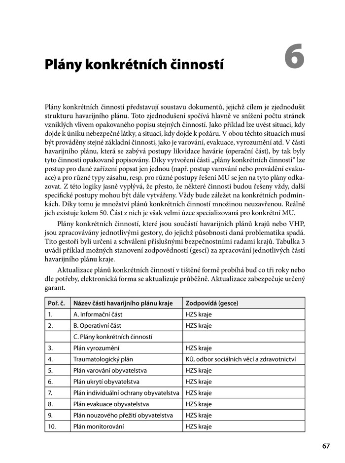 Publikace je určena studentům, pedagogům, pracovníkům státní správy a samosprávy a zájemcům o problematiku přípravy na možnost vzniku průmyslové havárie a její řešení. Popisuje jednotlivé části dokumentace, která je zpracovávána v rámci podniků pracujících s nebezpečnými látkami ve velkých množstvích. Díky detailnímu rozboru jednotlivých obsahových částí této dokumentace, čtenář po-chopí smysl a vzájemné vazby celého systému, který zůstává jinak skryt v pozadí. Publikace se zaměřuje hlavně na chemický průmysl a jadernou energetiku, avšak postupy a dokumenty zde popsané se využívají v celé řadě dalších oblastí a organizací, mezi tyto oblasti patří např. varování, evakuace, poplachové plány nebo povodňové plány.