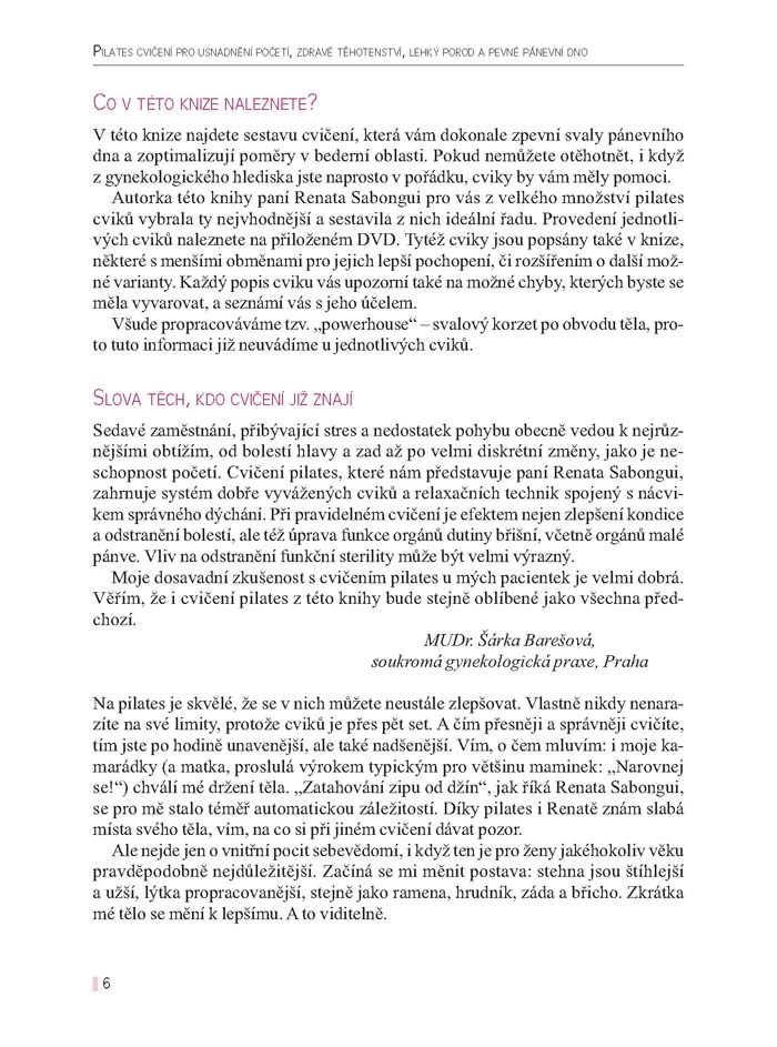 Jste úplně zdravá a přesto se vám nedaří otěhotnět? Zkušená lektorka metody Pilates, Mgr. Renata Sabongui, uznávaná v ČR i ve světě, pro vás sestavila unikátní řadu cvičení, které podobně jako rehabilitační cvičení nebo břišní tance pomáhají zpevnit svalstvo pánevního dna a zharmonizovat poměry v bederní oblasti a pánvi, čímž se zlepší podmínky pro přirozené početí. Zpevnění pánevního dna vám také přinese další výhody – intenzivnější zážitky v sexu, zdravé těhotenství, snadnější porod, po porodu rychlejší návrat do původní formy.
