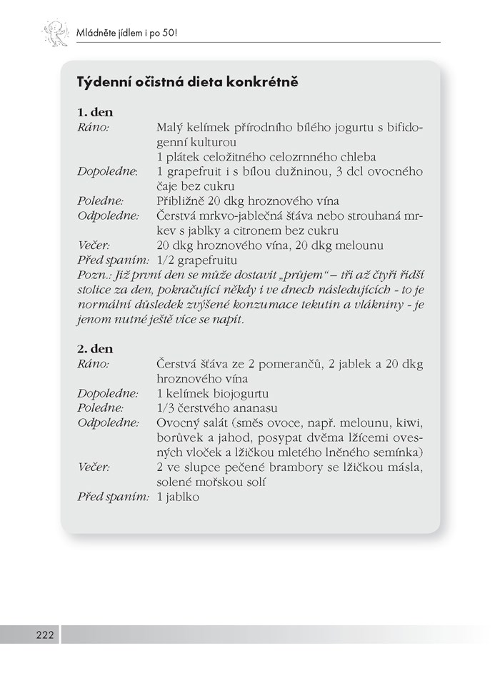 - Alternativní omlazovací postupy (lymfatická drenáž, ozonoterapie, chelátoterapie atd.) a detoxikace (navíc týdenní očistná dieta).