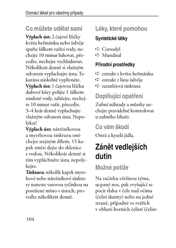 Klasický pomocník pro případ, že onemocníte a nemáte hned po ruce lékaře. Jak se můžete sami léčit? Jaké nejběžnější volně dostupné léky mohou pomoci? Které bylinky, čaje, obklady, zábaly a další tipy vám uleví od potíží? Obsahuje také zvláštní kapitolu věnovanou pouze dětským nemocem a potížím. Upozorňuje na situace, kdy je opravdu nutno navštívit lékaře. Nechybí ani část věnovaná zdravotní prevenci - kniha nabízí tipy na zdravé nápoje a potraviny, včetně zajímavých receptů, naleznete zde také návody na masáže, reflexní masáže, akupresuru, jógu, Qi Gong, dechová cvičení, svalovou relaxaci. Samozřejmě zde také naleznete základy první pomoci v akutních případech.