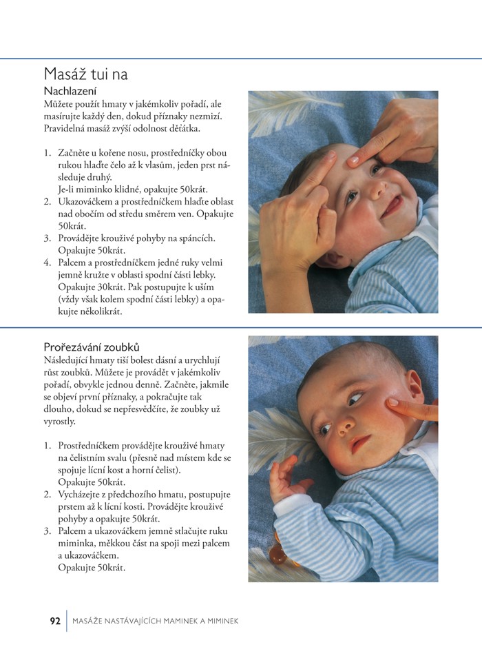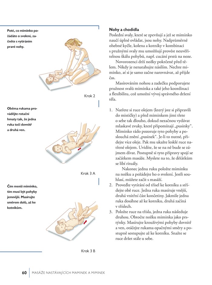 Naleznete v ní též mnoho jemných masážních hmatů, vhodné polohy pro masáž miminek i větších dětí, doporučené druhy esenciálních olejů, rady pro partnera, jak masírovat budoucí maminku, jak masáží pomáhat při porodu a po něm, a mnoho dalších užitečných informací.
