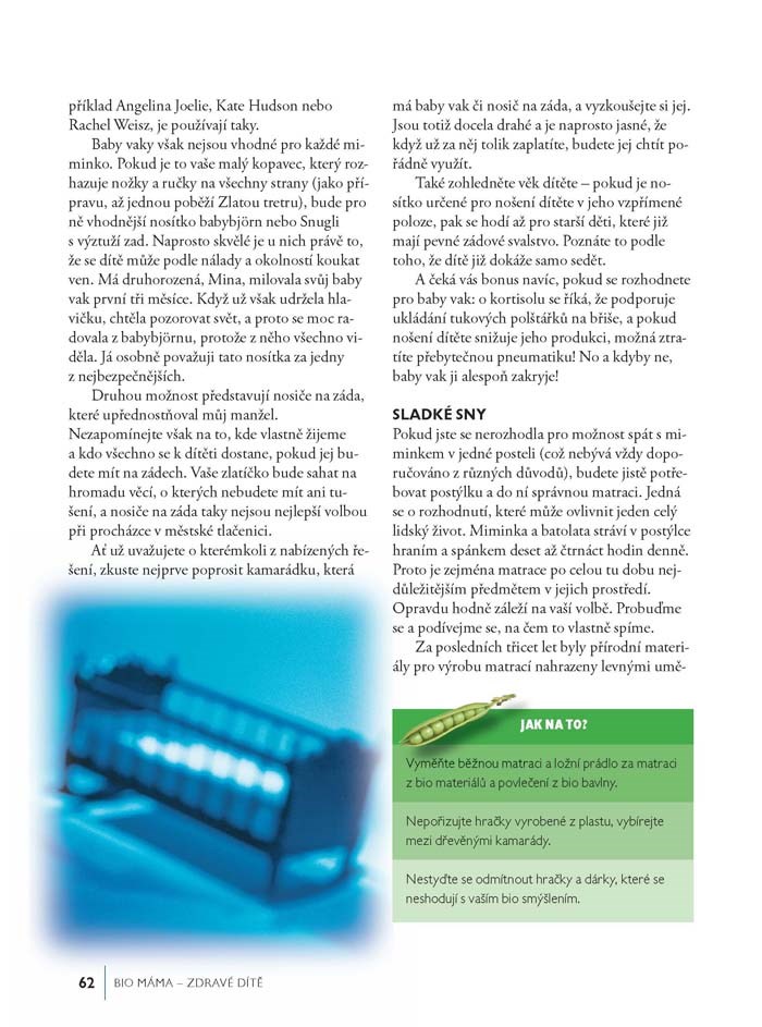 Naleznete také několik receptů na chutné a zdravé pokrmy z bioproduktů, doporučení na konkrétní výrobce kosmetiky a oblečení, na jejichž zdravotní nezávadnost se můžete spolehnout, srovnání výhod a nevýhod jednorázových plenek s látkovými. Seznámíte se s pravidly ekologického zemědělství, takže se dozvíte, proč jsou biopotraviny zdravější. Naučíte se uspořádat večírek pro přátele v duchu vstřícném k životnímu prostředí, budete umět uvázat indiánský šátek, abyste mohla dítě nosit na svém těle a přečtete si, co udělat pro to, abyste si vyzkoušela život na ekologické farmě.
