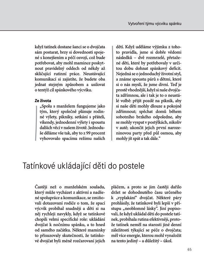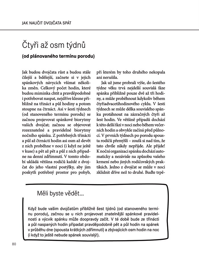 V knize se dozvíte, kdy je nejlépe s metodou učení spánku začít, a jednoduchý postup popsaný v pěti krocích. Protože potřeba spánku je u každé věkové skupiny dětí jiná, autor se podrobněji zabývá jednotlivými etapami v životě dětí, počínaje narozením až do čtyř let věku. Kromě toho vás autor seznámí s uklidňujícími rituály a vysvětlí, jak je důležitá komunikace mezi partnery a vytvoření soudržného „týmu“. Poukazuje také na zajímavé souvislosti mezi „spánkovým chováním“ dětí počatých umělým oplodněním a rozdíly mezi jednovaječnými a dvojvaječnými dvojčaty. Nechybí ani kapitola o kojení dvojčat a úskalím s tím spojeným.