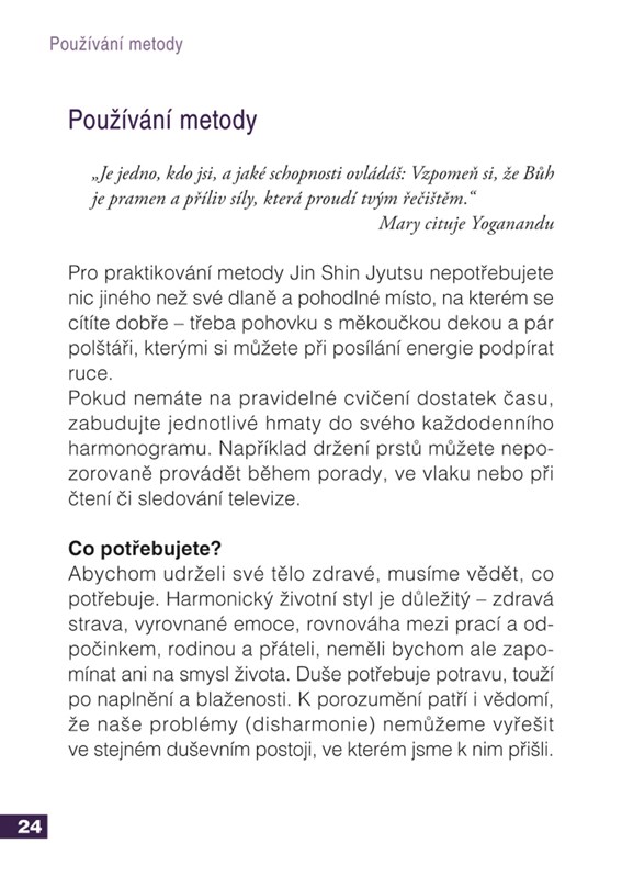 V této jedinečné sadě naleznete 48 větších karet a knihu, díky nimž se naučíte jednoduchým, ale účinným samoléčebným postupům. Sami si můžete odstranit některé energetické bloky, zharmonizovat a posílit tělesnou energii či předejít zdravotním potížím a nemocem. Pokud nemáte žádné přesně definovatelné potíže, můžete postupně provádět hmaty na jednotlivých zámcích, a ještě více svůj organismus posílit.